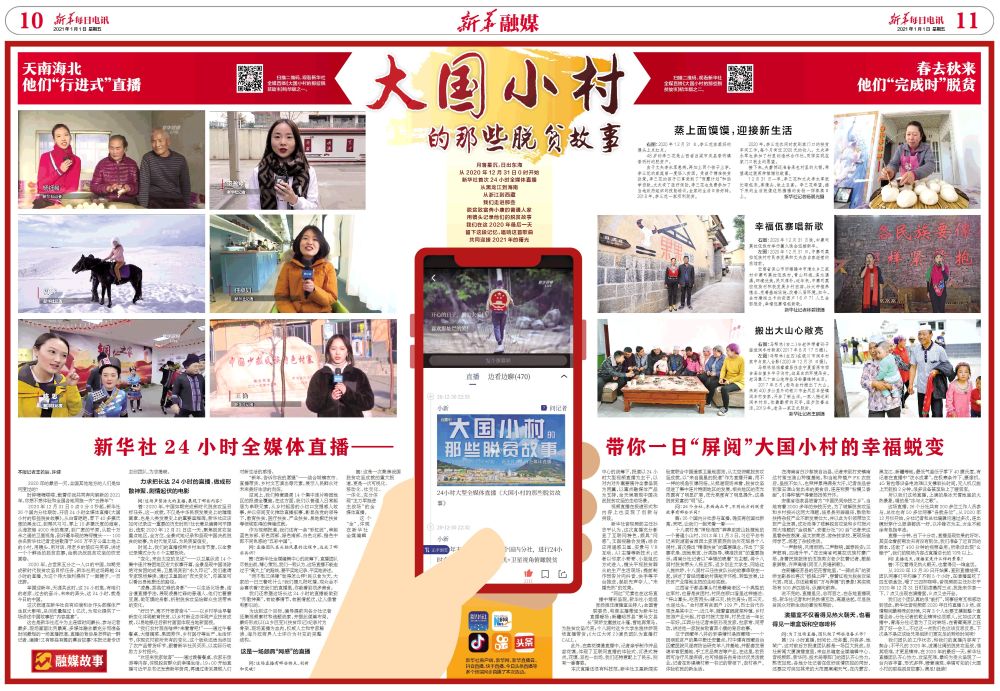 2020年12月31日0點(diǎn)0分0秒起,新華社26個(gè)國(guó)內(nèi)分社聯(lián)動(dòng),開(kāi)啟24小時(shí)全媒體直播《大國(guó)小村的那些脫貧故事》。從白雪皚皚、零下40多攝氏度的黑龍江,到椰風(fēng)習(xí)習(xí)、零上10多攝氏度的海南,從海拔超4000米的高原,到廣袤的平原,從數(shù)十萬(wàn)米之遙的衛(wèi)星視角,到纖毫畢現(xiàn)的特寫(xiě)鏡頭……100余名新華社記者走進(jìn)散落于960萬(wàn)平方公里土地上的小村,用鏡頭、用對(duì)話(huà)、用老鄉(xiāng)的皺紋與笑容,講述一個(gè)個(gè)鮮活的脫貧故事,繪就決戰(zhàn)脫貧攻堅(jiān)的恢宏畫(huà)卷。