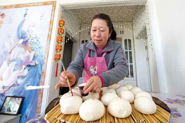 ▲2020年12月31日,李三花在蒸好的饅頭上點(diǎn)紅點(diǎn)。新華社記者楊晨光攝