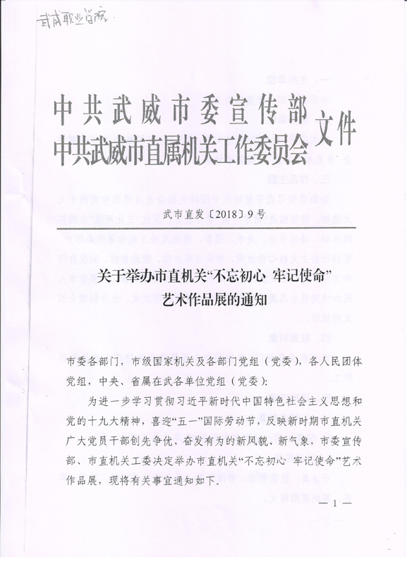 關(guān)于組織參加武威市直屬機關(guān)“不忘初心 牢記使命”藝術(shù)作品展的通知