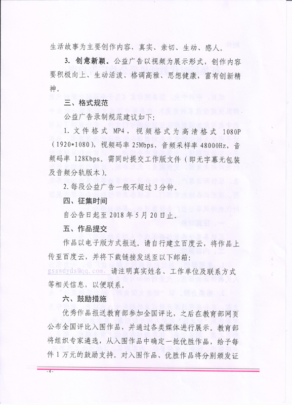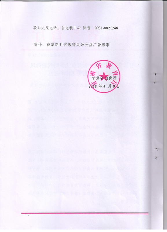 ???? 現(xiàn)將甘肅省教育廳《甘肅省教育廳關(guān)于做好征集新時(shí)代教師風(fēng)采公益廣告有關(guān)工作的通知》(甘教師函〔2018〕24號(hào))轉(zhuǎn)發(fā)你們,請各部門、單位根據(jù)通知要求認(rèn)真組織,積極參與。將參賽作品于5月15日前報(bào)宣傳統(tǒng)戰(zhàn)部辦公室,宣傳統(tǒng)戰(zhàn)部對報(bào)送作品匯總后統(tǒng)一報(bào)送省教育廳電教中心。