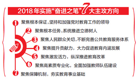 陳寶生指出,黨的十九大對教育工作作出了全面系統(tǒng)部署。在加快教育現(xiàn)代化、建設(shè)教育強(qiáng)國的新征程中,解決教育發(fā)展不平衡不充分的問題將是我們長期要面對的工作主題。要以問題為導(dǎo)向,將其作為實(shí)施“奮進(jìn)之筆”的著力點(diǎn)和主攻方向。一是聚焦根本保證,堅(jiān)持和加強(qiáng)黨對教育工作的領(lǐng)導(dǎo)。要把黨的政治建設(shè)擺在首位,狠抓大抓基層黨組織建設(shè),持之以恒正風(fēng)肅紀(jì),抓好意識形態(tài)工作。二是聚焦根本任務(wù),系統(tǒng)推進(jìn)立德樹人。要把德育擺在更加重要的位置,堅(jiān)定青少年理想信念,改進(jìn)和加強(qiáng)思想政治工作,大力發(fā)展素質(zhì)教育,加強(qiáng)語言文字工作。三是聚焦人民群眾關(guān)切,不斷完善公共教育服務(wù)體系。要促進(jìn)學(xué)前教育普惠健康發(fā)展,加快城鄉(xiāng)義務(wù)教育一體化發(fā)展步伐,加大普及高中階段教育攻堅(jiān)力度,加大對困難地區(qū)扶持力度,切實(shí)加強(qiáng)校園安全。四是聚焦提升貢獻(xiàn)力,大力促進(jìn)教育內(nèi)涵發(fā)展。要以質(zhì)量為本,持續(xù)推進(jìn)職業(yè)教育質(zhì)量提升,健全高等教育內(nèi)涵發(fā)展政策機(jī)制,辦好繼續(xù)教育。五是聚焦激發(fā)活力,縱深推進(jìn)教育改革。要深化“放管服”改革,實(shí)施考招改革“拓展深化”攻堅(jiān)行動,支持和規(guī)范社會力量興辦教育,堅(jiān)定不移以開放促改革。六是聚焦高素質(zhì)專業(yè)化,全面加強(qiáng)教師隊(duì)伍建設(shè)。實(shí)施教師隊(duì)伍“建設(shè)改革”攻堅(jiān)行動,健全師德師風(fēng)建設(shè)長效機(jī)制,完善教師管理制度,提升教師獲得感、幸福感和榮譽(yù)感。七是聚焦保障機(jī)制,夯實(shí)教育事業(yè)基礎(chǔ)。要落實(shí)教育投入責(zé)任,加快教育信息化步伐,全力推進(jìn)依法治教。