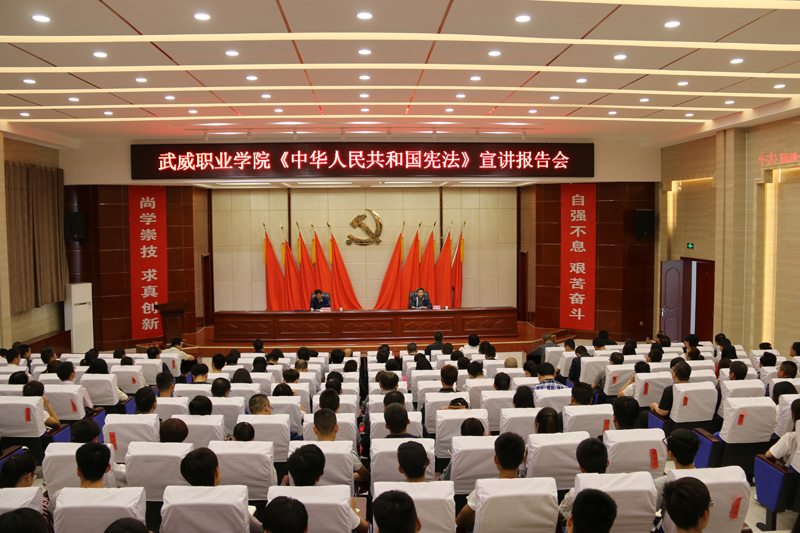 為深入推進(jìn)《中華人民共和國憲法》和《中華人民共和國憲法(修正案)》學(xué)習(xí)宣傳,提高廣大師生“學(xué)習(xí)憲法、尊崇憲法”的自覺性,6月7日,武威職業(yè)學(xué)院組織開展專題宣講活動(dòng),邀請市檢察院檢委會(huì)專職委員郝建宏檢察官來學(xué)院作宣講報(bào)告。學(xué)院領(lǐng)導(dǎo)班子成員,副科級(jí)以上干部及師生代表共220余人參加了宣講報(bào)告會(huì)。報(bào)告會(huì)由黨委副書記趙明主持。