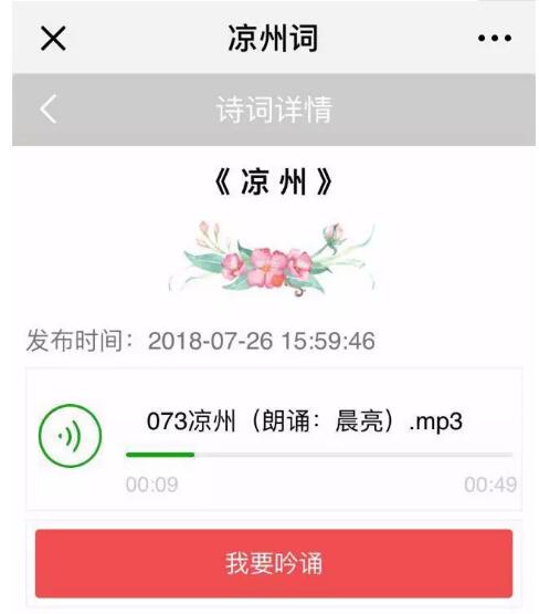 2.單擊自己選定的條目或詩詞名即可進入吟誦頁面,點擊”我要吟誦”開始錄入音頻,?吟誦結(jié)束后點擊提交,保存音頻資料即可完成吟誦,已保存的詩詞音頻可在“我的吟誦”列表查看。