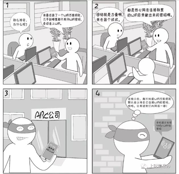 手機(jī)上的WIFI萬能鑰匙類的APP在安裝后默認(rèn)設(shè)置會自動上傳你所連接的WIFI的密碼。這些密碼一般不會明文給出,只會在連接WIFI時自動輸入,但曾爆出漏洞用一個APP能讀出檢測到WIFI的密碼,這樣就可以用筆記本接入WIFI使用更強(qiáng)大的攻擊工具了。