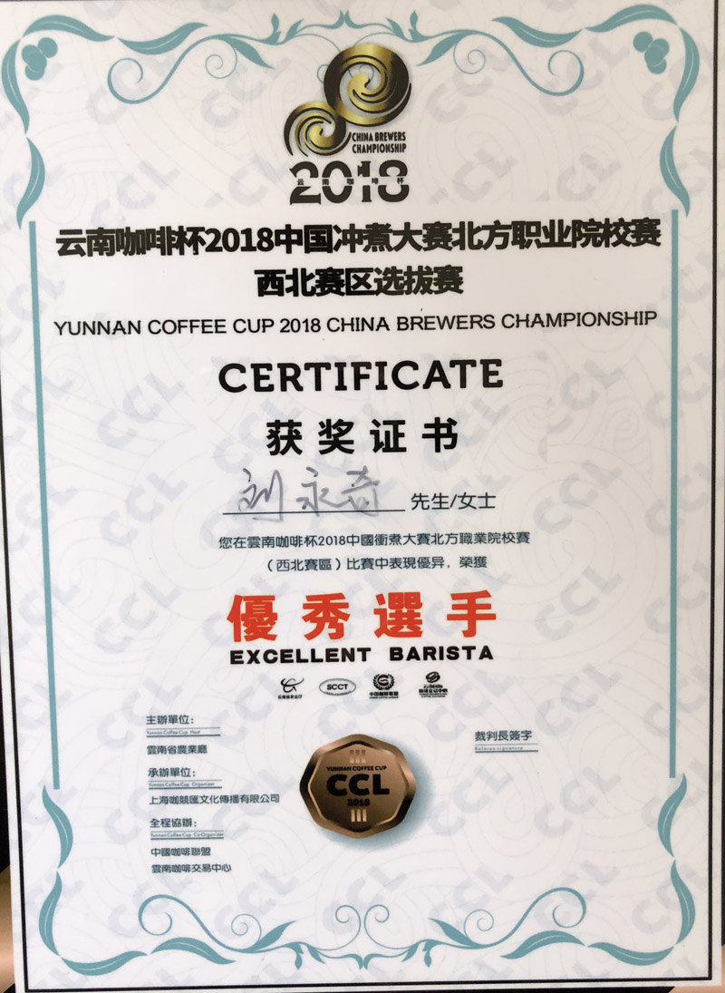 我院學生榮獲“云南咖啡杯2018中國沖煮大賽北方職業(yè)院校賽西北賽區(qū)選拔賽”季軍