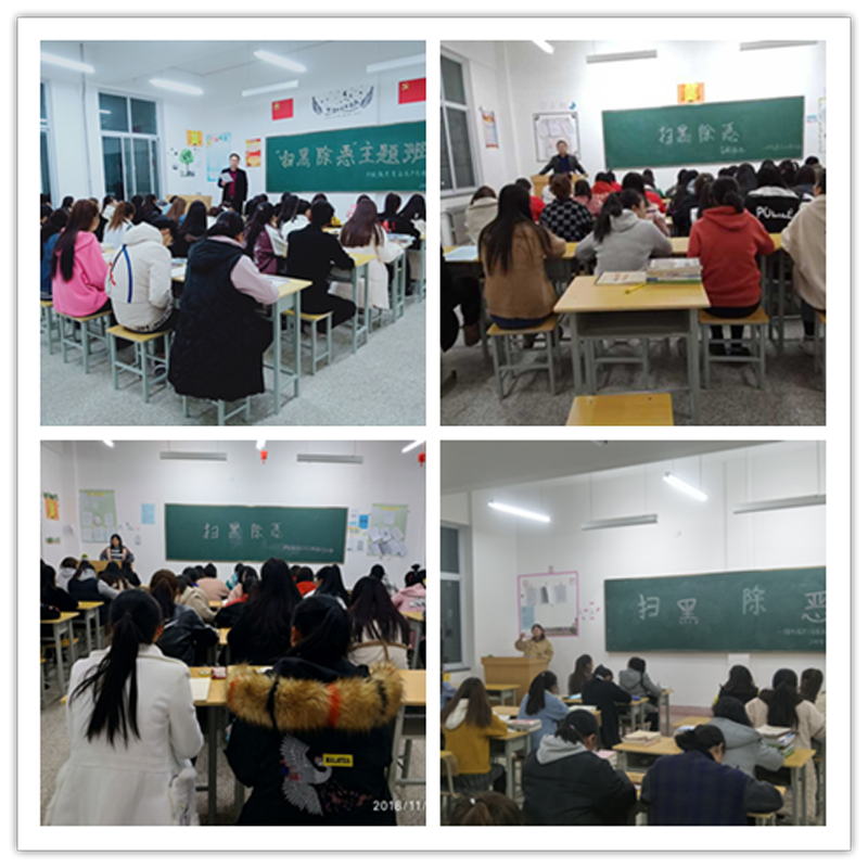 各班班主任精心準(zhǔn)備,帶領(lǐng)學(xué)生學(xué)習(xí)“掃黑除惡”宣傳材料。重點(diǎn)針對(duì)“校園貸”、“老鄉(xiāng)會(huì)”、“黃賭毒”、校園欺凌和網(wǎng)絡(luò)威脅等違法犯罪行為進(jìn)行深刻剖析,并提出了行之有效的防范措施,確保師生人身和財(cái)產(chǎn)安全。