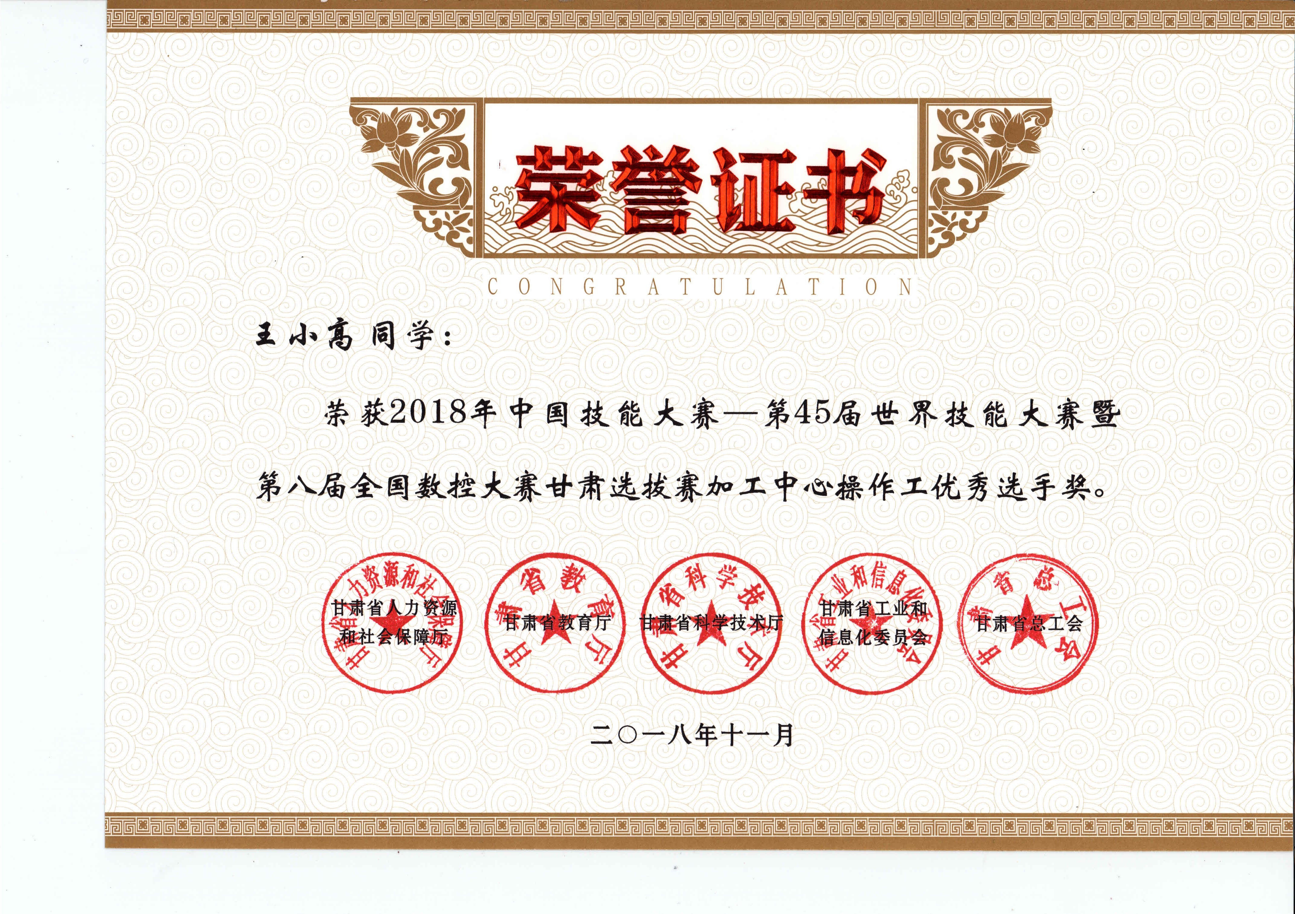 2018年中國技能大賽--第45屆世界技能大賽暨第八屆全國數(shù)控大賽甘肅選拔賽(加工中心項目)獲獎證書