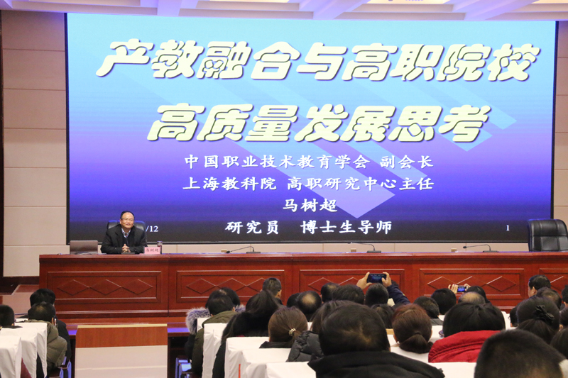 2018年12月11日,學(xué)院邀請(qǐng)到全國(guó)著名職業(yè)教育專家,上海教科院高職研究中心主任,博士生導(dǎo)師、馬樹超研究員來我院指導(dǎo)辦學(xué)工作,并作了“綠洲講壇”《產(chǎn)教融合與高職院校高質(zhì)量發(fā)展》主旨報(bào)告。