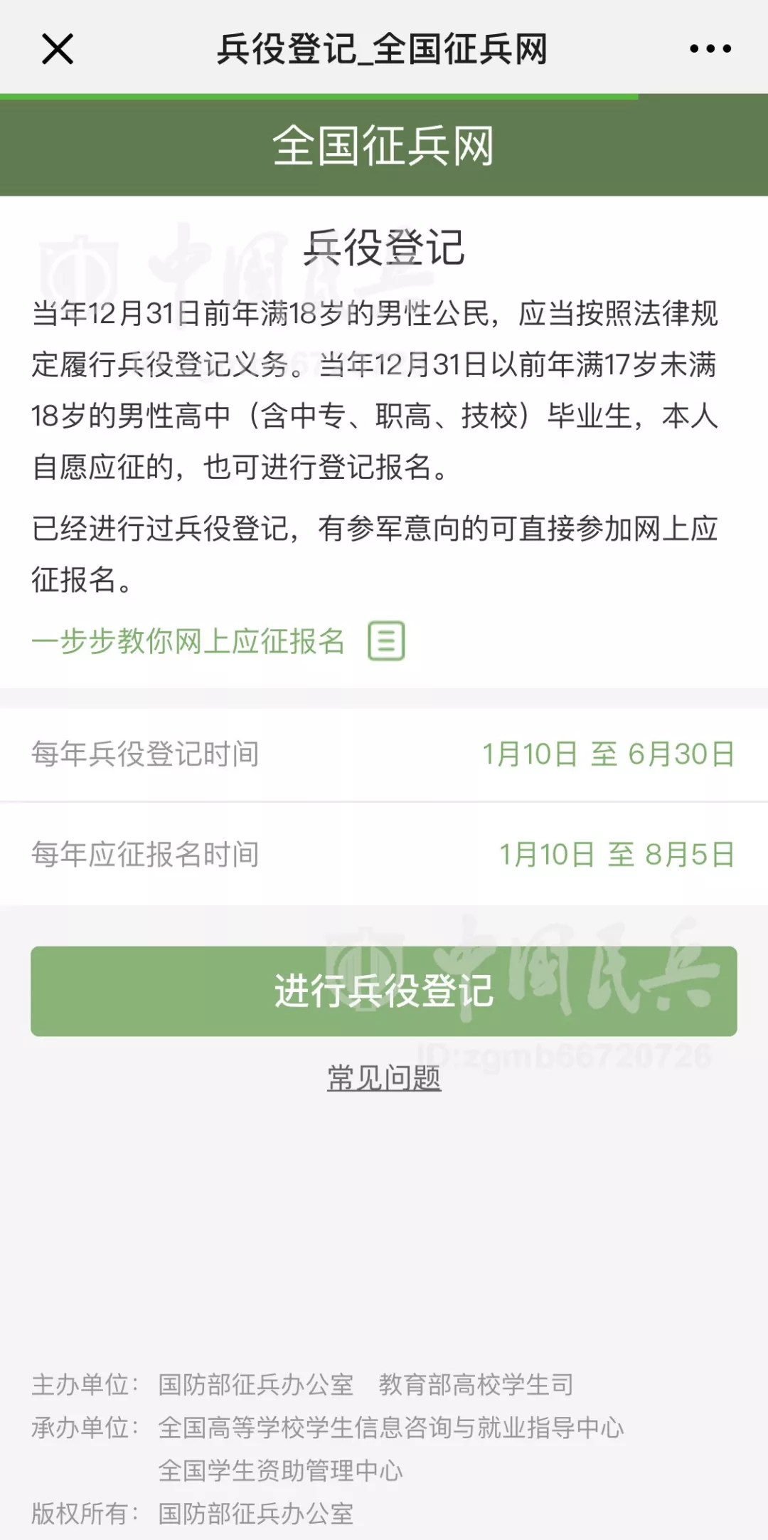 中國民兵北京1月9日電?張東華、記者劉國順報(bào)道:日前,國防部征兵辦公室下發(fā)《關(guān)于做好2019年征兵準(zhǔn)備工作的通知》,對(duì)新年度征兵準(zhǔn)備工作進(jìn)行安排部署,要求各地深入貫徹習(xí)近平強(qiáng)軍思想,全面聚焦備戰(zhàn)打仗,統(tǒng)籌推進(jìn)征兵組織建設(shè)、能力建設(shè)、法規(guī)建設(shè)、廉政建設(shè),確保高質(zhì)量完成新年度征兵任務(wù),并明確全國征兵網(wǎng)(網(wǎng)址:http://www.gfbzb.gov.cn),或關(guān)注“中國民兵”微信公眾號(hào)(ID:zgmb66720726)1月10日正式開通,受理網(wǎng)上兵役登記、應(yīng)征報(bào)名和政策咨詢等工作事項(xiàng)。