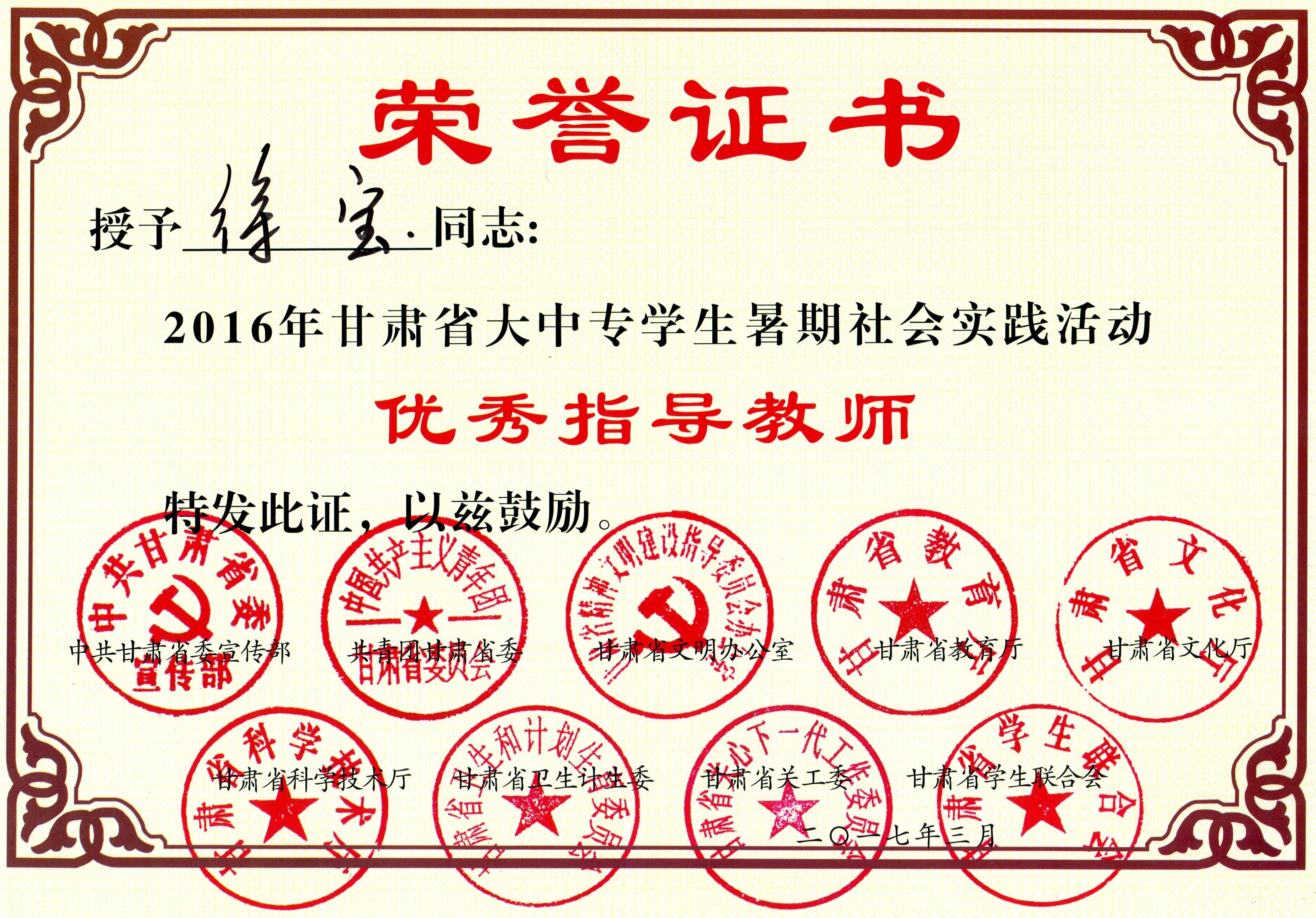 甘肅省大中專學(xué)生暑期社會(huì)實(shí)踐活動(dòng)優(yōu)秀指導(dǎo)教師