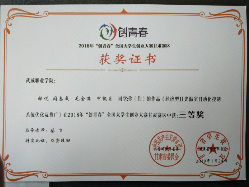 現(xiàn)代農(nóng)業(yè)技術系兩件作品獲得2018年“創(chuàng)青春”全國大學生創(chuàng)業(yè)大賽甘肅賽區(qū)三等獎
