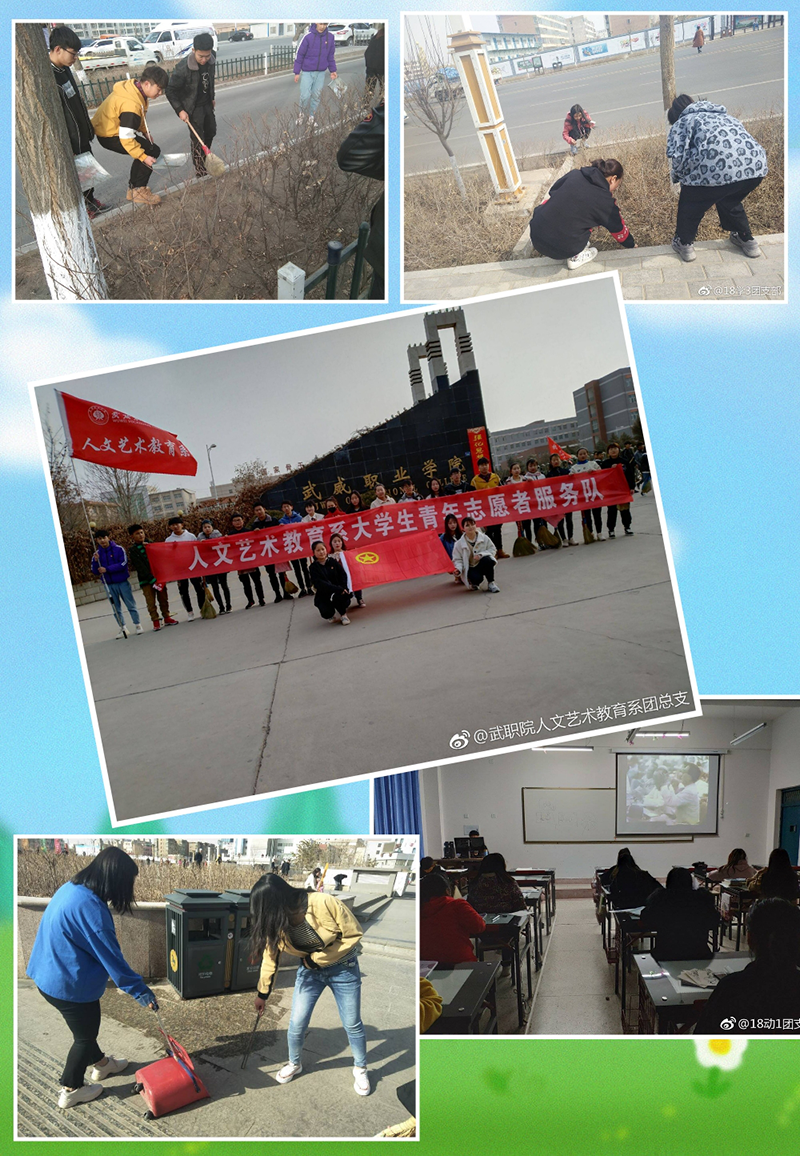 活動(dòng)開始階段,我系組織各班觀看《向雷鋒同志學(xué)習(xí)》的紀(jì)錄片,同時(shí)開展“環(huán)境保護(hù)從我做起”校園服務(wù)活動(dòng),3月9日由系輔導(dǎo)員齊斌文老師帶領(lǐng)志愿者們到武威市文化廣場(chǎng)開展清潔志愿活動(dòng);3月17日由唐鑫基老師帶隊(duì)前往涼州區(qū)高壩敬老院開展志愿服務(wù)活動(dòng);3月29日由馮燕老師帶隊(duì)前往雷臺(tái)公園開展志愿服務(wù)。