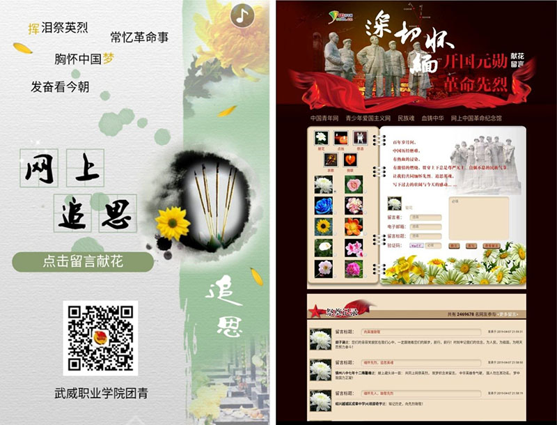 院團(tuán)委在“武威職業(yè)學(xué)院團(tuán)青”微信公眾平臺開設(shè)清明網(wǎng)上祭英烈專欄,共有3968名同學(xué)參與了線上活動。同學(xué)們帶著誠摯的敬意向烈士們鞠躬、獻(xiàn)花,并在留言區(qū)發(fā)表祭掃寄語,以此緬懷先烈的豐功偉績,追憶烈士之德。