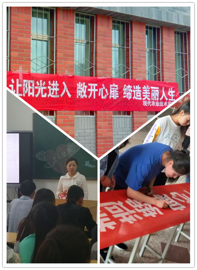 邀請(qǐng)現(xiàn)代農(nóng)業(yè)技術(shù)系張曉燕老師做了題為《預(yù)見(jiàn)未知的自己》的講座;系團(tuán)學(xué)會(huì)組織學(xué)生參加“打開(kāi)心靈的窗戶(hù),讓陽(yáng)光進(jìn)入;敞開(kāi)心扉,締造美麗人生?!敝黝}簽名活動(dòng)。各班召開(kāi)心理健康主題班會(huì)、開(kāi)展心理游戲和手抄報(bào)活動(dòng)。