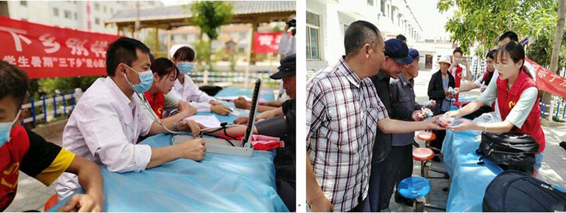 醫(yī)療服務(wù)團每到一個服務(wù)點,當(dāng)?shù)氐拇迕穸紩吁喽鴣恚瑦坌尼t(yī)療服務(wù)團的隊員顧不上休息就迅速投入到診療服務(wù)中,對于每位咨詢及就診的群眾,老師和隊員都是熱情認真、耐心細致、深入淺出地一一講解。有的志愿者協(xié)助老師為就診群眾測量血壓、血糖,面對血壓和血糖偏高的老人,告之他們檢查指標(biāo)偏高的危險,提醒他們聽從醫(yī)囑按時服藥,有的志愿者進村入戶,發(fā)放〈夏季常見病防治知識〉宣傳單,開展醫(yī)療衛(wèi)生知識宣傳教育活動,幫助村民提高自我保健意識,尤其是對一些常見病、多發(fā)病的認識,以便做到早發(fā)現(xiàn)、早診斷、早治療?;顒又谐肆x診和宣教,還教會了部分居民針對呼吸心跳驟停病人盡快施行心肺復(fù)蘇(CPR)的現(xiàn)場應(yīng)急救護技術(shù)。