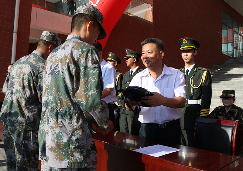 翟存祥代表學(xué)院向軍訓(xùn)教官表示衷心的感謝,祝愿應(yīng)征入伍的同學(xué)們在部隊(duì)進(jìn)一步譜寫人生華章,并向參加軍訓(xùn)的全體同學(xué)致以親切的問候。他指出,舉行大學(xué)生應(yīng)征入伍歡送儀式,就是要鼓勵(lì)大學(xué)生樹立“天下興亡,匹夫有責(zé)”的國防教育觀念,軍訓(xùn)旨在培養(yǎng)同學(xué)們的國防意識和愛國主義精神,培養(yǎng)同學(xué)們的組織紀(jì)律觀念,磨練同學(xué)們意志品德,培育和踐行社會(huì)主義核心價(jià)值觀!他要求參訓(xùn)學(xué)生要堅(jiān)守目標(biāo),做遵紀(jì)守法的優(yōu)秀戰(zhàn)士;要刻苦訓(xùn)練,做軍事訓(xùn)練的優(yōu)秀學(xué)子;要?jiǎng)?lì)志成才,做中國特色社會(huì)主義合格建設(shè)者和可靠接班人。他希望同學(xué)們牢記習(xí)近平總書記的殷殷囑托、諄諄教誨,不忘初心、牢記使命,勇于擔(dān)當(dāng)這個(gè)時(shí)代賦予的歷史責(zé)任,樹立遠(yuǎn)大理想,堅(jiān)持勵(lì)志勤學(xué),在激情奮斗中綻放青春光芒,立志成為中國特色社會(huì)主義偉大事業(yè)的有用人才。