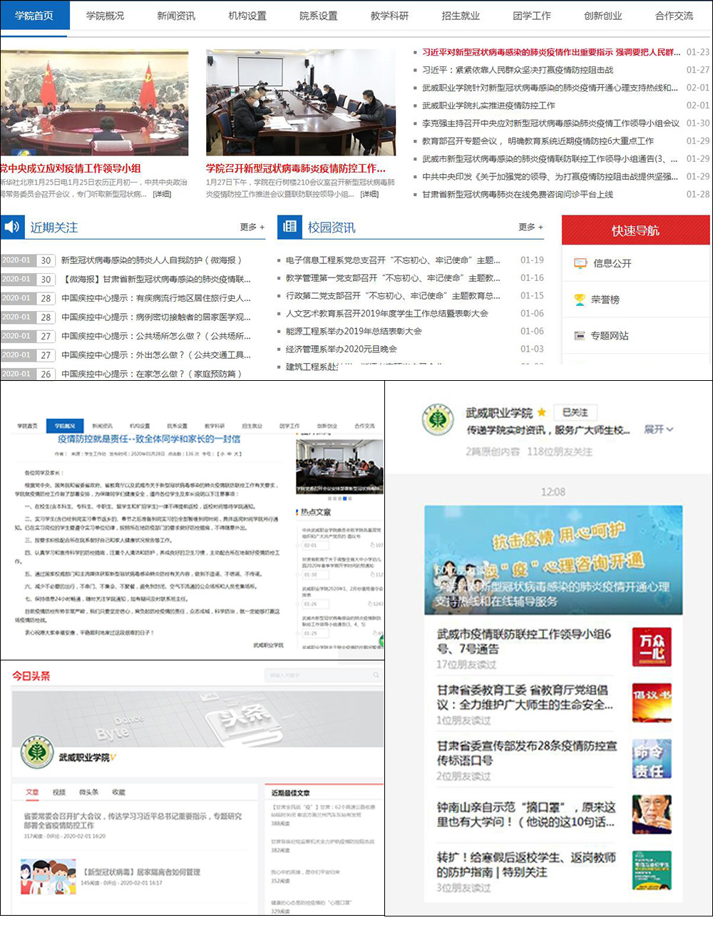 學(xué)院通過網(wǎng)站、微信公眾號、隴政釘、微信群、QQ群等平臺,第一時間刊載轉(zhuǎn)發(fā)習(xí)近平總書記重要指示、李克強總理批示,中共中央、教育部、省委、省教育工委、武威市委關(guān)于做好新型冠狀病毒感染肺炎疫情防控工作的重要會議、文件、通知以及《武威職業(yè)學(xué)院致全體同學(xué)和家長的一封信》《中共武威職業(yè)學(xué)院委員會致學(xué)院各基層黨組織和廣大共產(chǎn)黨員的倡議書》和防控知識50多條;做到宣傳教育和正面引導(dǎo)覆蓋到每一位教師、每一個班級、每一位學(xué)生,確保師生和學(xué)生家長及時了解疫情發(fā)展態(tài)勢、臨床癥狀和學(xué)習(xí)掌握防控知識;做到科學(xué)認(rèn)識、理性判斷、合理應(yīng)對,不信謠、不傳謠,養(yǎng)成健康的防控生活習(xí)慣,堅定信心、眾志成城防控疫情、戰(zhàn)勝疫情。