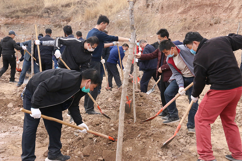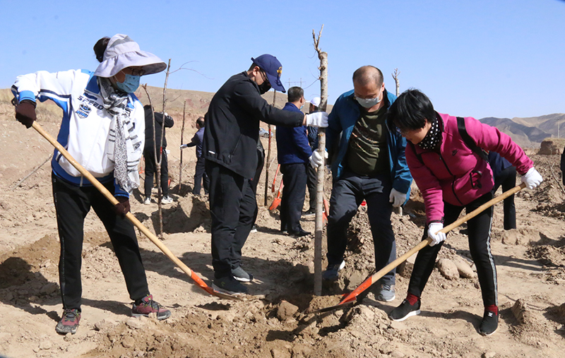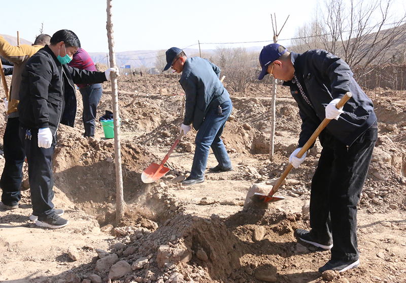 春風(fēng)吹拂處,新綠綻枝頭。為深入學(xué)習(xí)貫徹習(xí)近平總書(shū)記視察甘肅的重要講話(huà)和批示精神,認(rèn)真踐行綠水青山就是金山銀山的發(fā)展理念,實(shí)施綠色發(fā)展戰(zhàn)略,進(jìn)一步加強(qiáng)祁連山生態(tài)環(huán)境保護(hù)與治理,幫助幫扶鎮(zhèn)打贏脫貧攻堅(jiān)戰(zhàn),實(shí)施鄉(xiāng)村振興戰(zhàn)略,4月9日,學(xué)院領(lǐng)導(dǎo)班子成員、幫扶干部、駐村干部及部分教職工70多人深入結(jié)對(duì)幫扶鎮(zhèn)——黑松驛鎮(zhèn)開(kāi)展義務(wù)植樹(shù)活動(dòng),建設(shè)“生態(tài)示范林”。春光沐浴的祁連山腳下黑松驛鎮(zhèn),春意盎然,生機(jī)勃勃,正是植樹(shù)好時(shí)節(jié)。廣大教職工一下車(chē)就拿起鐵鍬到植樹(shù)現(xiàn)場(chǎng),與黑松驛鎮(zhèn)政府部分干部一起投入植樹(shù)活動(dòng),按照“橫看直線(xiàn)側(cè)一線(xiàn)、三埋兩踩一提苗”的技術(shù)要求,三人一組,分工協(xié)作,有序配合,揮鍬培土、扶苖踩土、圍堰澆水,現(xiàn)場(chǎng)一派熱火朝天的勞動(dòng)景象。當(dāng)天植樹(shù)育林約20余畝,一棵棵新栽的樹(shù)苗整齊排列,迎風(fēng)挺立。通過(guò)義務(wù)植樹(shù),廣大教職工用實(shí)際行動(dòng)傳播著生態(tài)文明、綠色發(fā)展理念,切實(shí)幫助幫扶鎮(zhèn)綠起來(lái),美起來(lái),富起來(lái)。