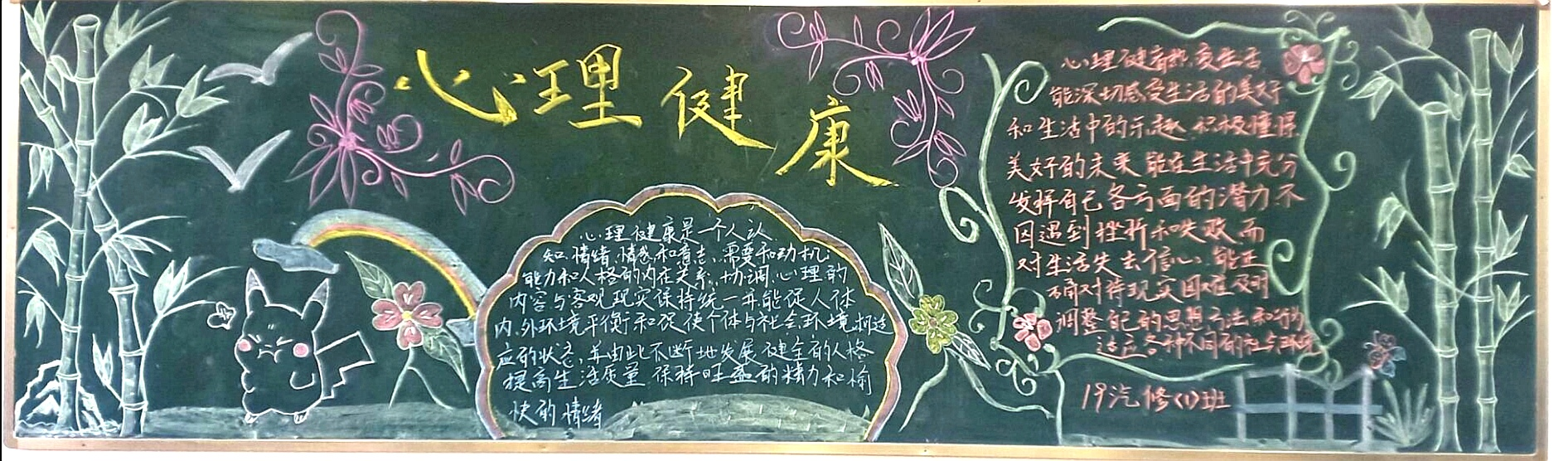為進一步提高大學生的心理素質(zhì),促進大學生的身心健康和諧,宣傳普及心理健康知識,深入開展心理健康教育,我系結(jié)合學院特點,突出專業(yè)優(yōu)勢,在積極承擔和參與學校心理健康活動月的團日活動的同時,各班開展了豐富多彩的以“心理健康”為主題的黑板報。