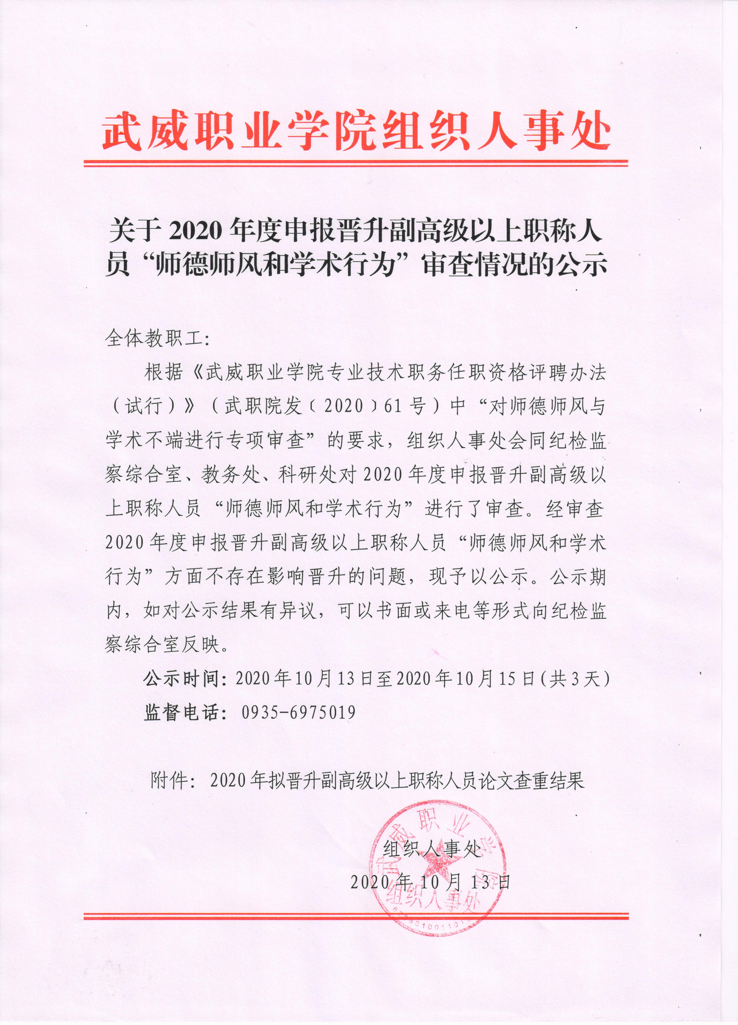 關(guān)于2020年度申報晉升副高級以上職稱人員“師德師風(fēng)和學(xué)術(shù)行為”審查情況的公示
