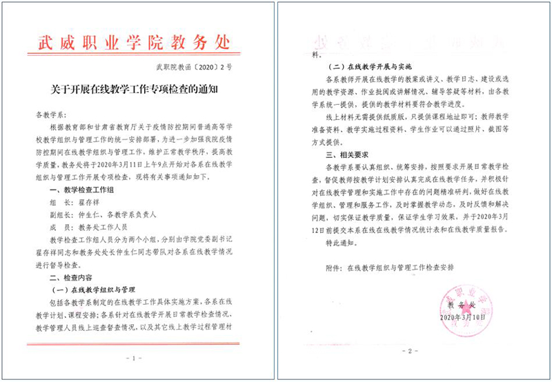 各院系及相關(guān)部門要按照教育部和省教育廳關(guān)于疫情防控期間在線教學(xué)工作的文件精神和《武威職業(yè)學(xué)院新型冠狀病毒肺炎疫情防控期間在線教學(xué)工作實施方案》的相關(guān)要求進行全面自查,做到文件精神及要求全部落實到位、不打折扣;對執(zhí)行情況進行認(rèn)真總結(jié),通過自查深入挖掘現(xiàn)階段在線教學(xué)實施和組織管理過程中的重點問題,利用各系教研活動和教研團隊推動開展教學(xué)研究和人才培養(yǎng)模式改革研究,全面落實問題導(dǎo)向,推動在線教學(xué)工作落實落細落地。