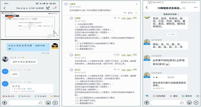 機械制造系和電信系的教師在課后積極收集學(xué)生的提問或者疑難問題,利用課余或周末的時間,在家中通過白板講解、紙筆講解的方式利用釘釘群直播講解練習(xí)題,開展互動答疑。