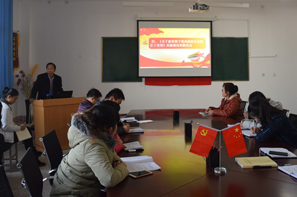 報(bào)告會重點(diǎn)從十八屆六中全會的重大成果及意義、為何聚焦“從嚴(yán)治黨”、十八屆六中全會為全面從嚴(yán)治黨做出的重要貢獻(xiàn)、《關(guān)于新形勢下黨內(nèi)政治生活的若干準(zhǔn)則》的新提法新亮點(diǎn)、《中國共產(chǎn)黨黨內(nèi)監(jiān)督條例》的新提法新亮點(diǎn)五個方面給師生做了解讀。