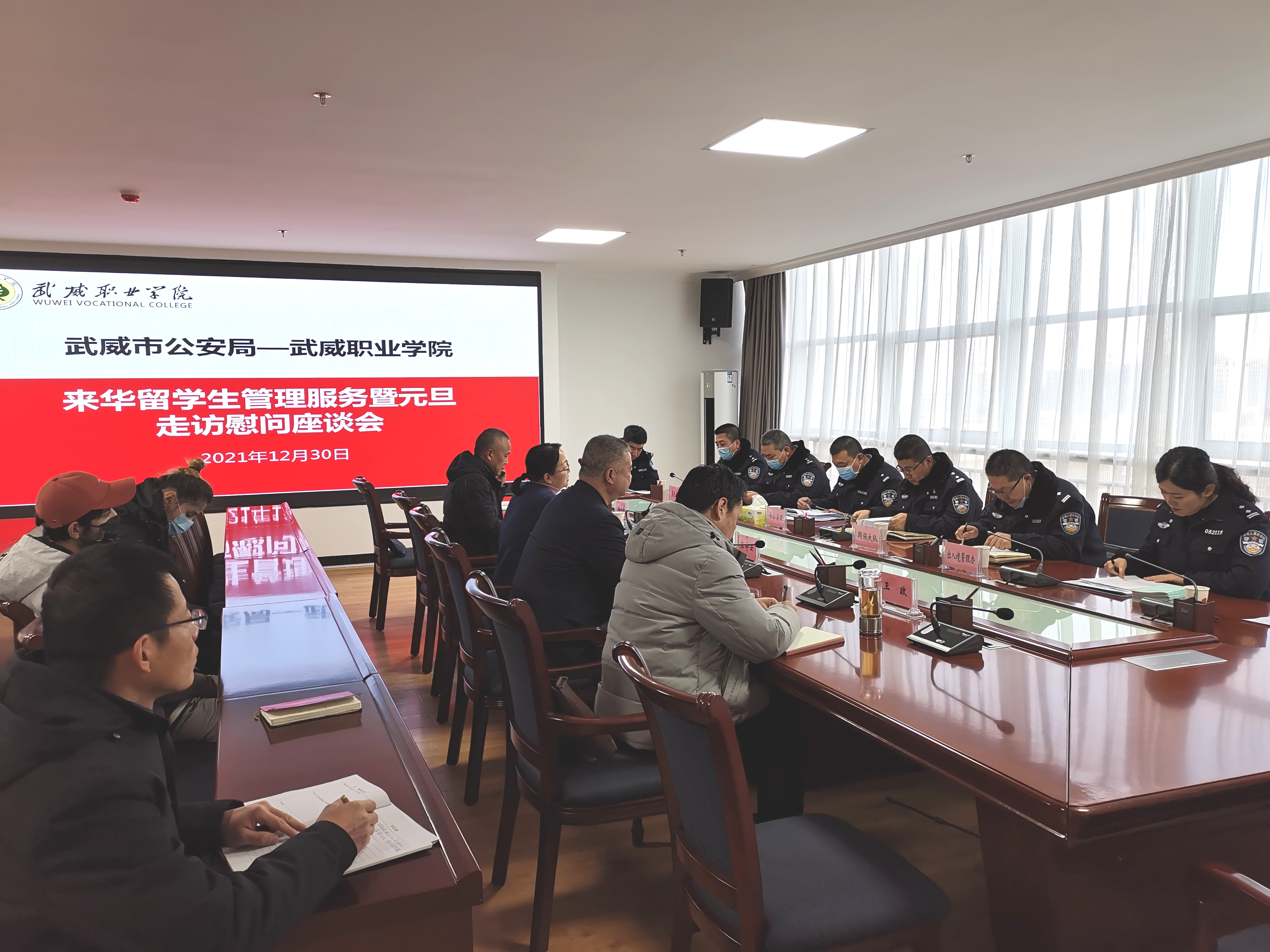 12月30日上午,市公安局出入境管理科、非政府組織管理辦公室,市公安局涼州分局國(guó)安大隊(duì)、反恐大隊(duì)、出入境管理辦公室、涼州分局西關(guān)街派出所一行十一人到訪學(xué)院,開展來(lái)華留學(xué)生管理服務(wù)暨元旦走訪慰問活動(dòng)。黨委委員、副院長(zhǎng)田迎春、王守云出席活動(dòng)。國(guó)際合作與交流處處長(zhǎng)潘從民、保衛(wèi)處處長(zhǎng)王政及相關(guān)人員,2019級(jí)、2021級(jí)在華留學(xué)生參加活動(dòng)。田迎春主持活動(dòng)。