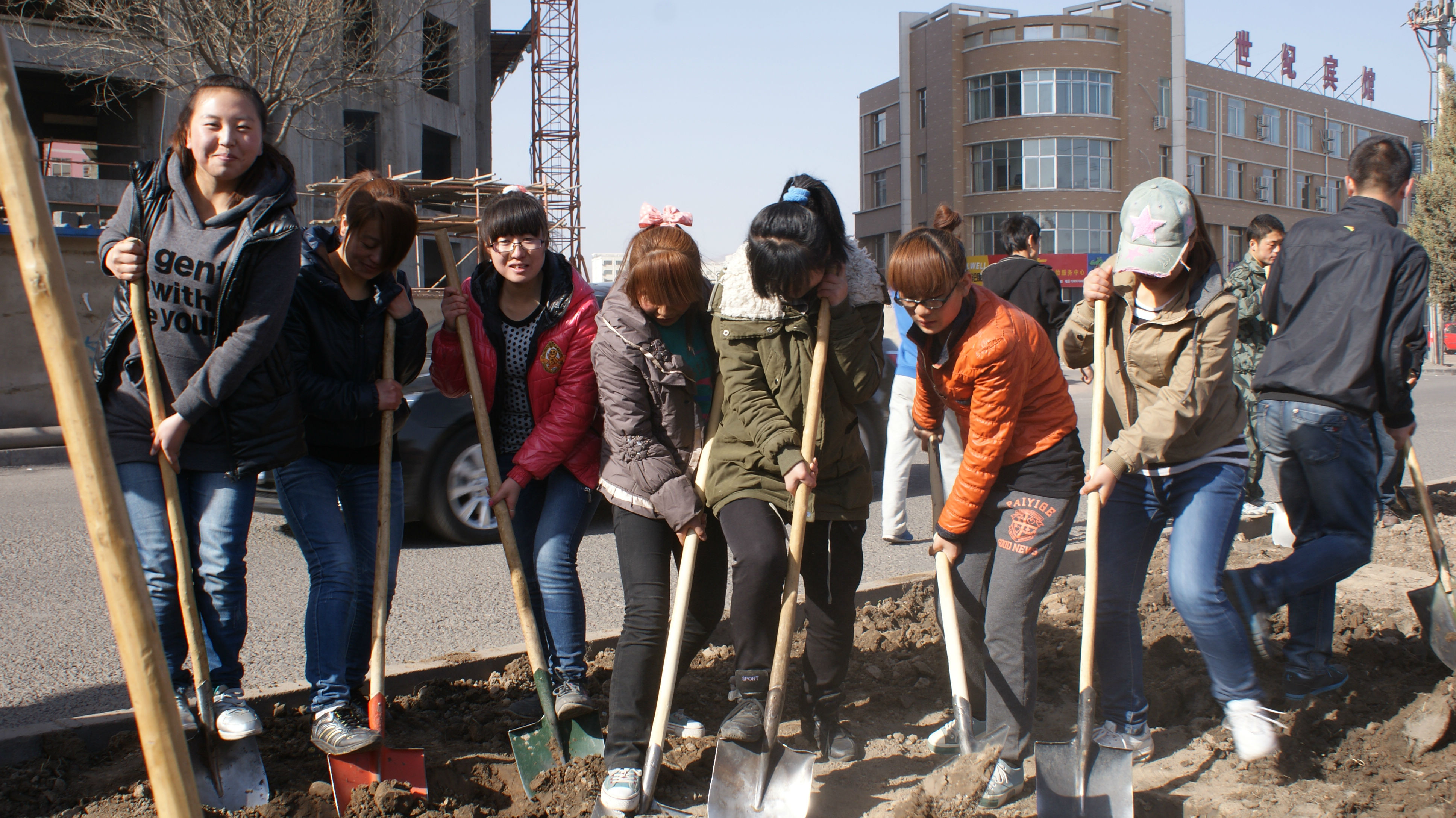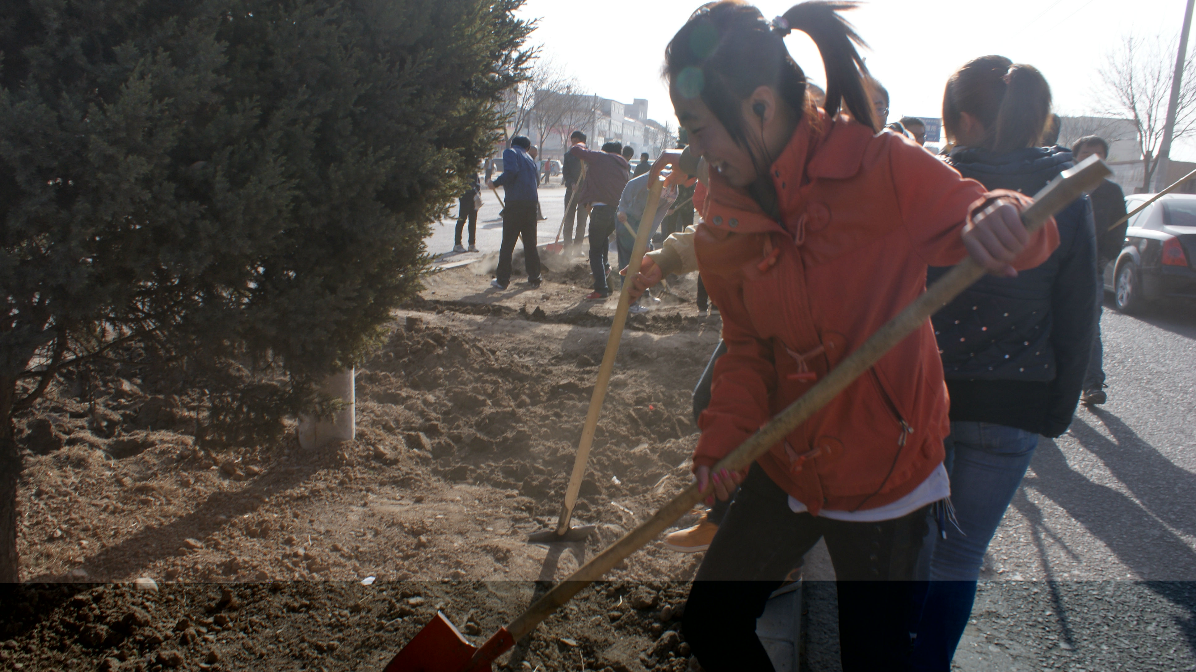 大家早早的來到了目的地,很快投入了植樹和凈化街道的隊伍中。同學(xué)們井然有序,手持鐵鍬,一鍬一鍬的鏟土,一片一片的清理大街,干勁十足。同學(xué)們無一不閃爍著汗珠,露出幸福的笑容。