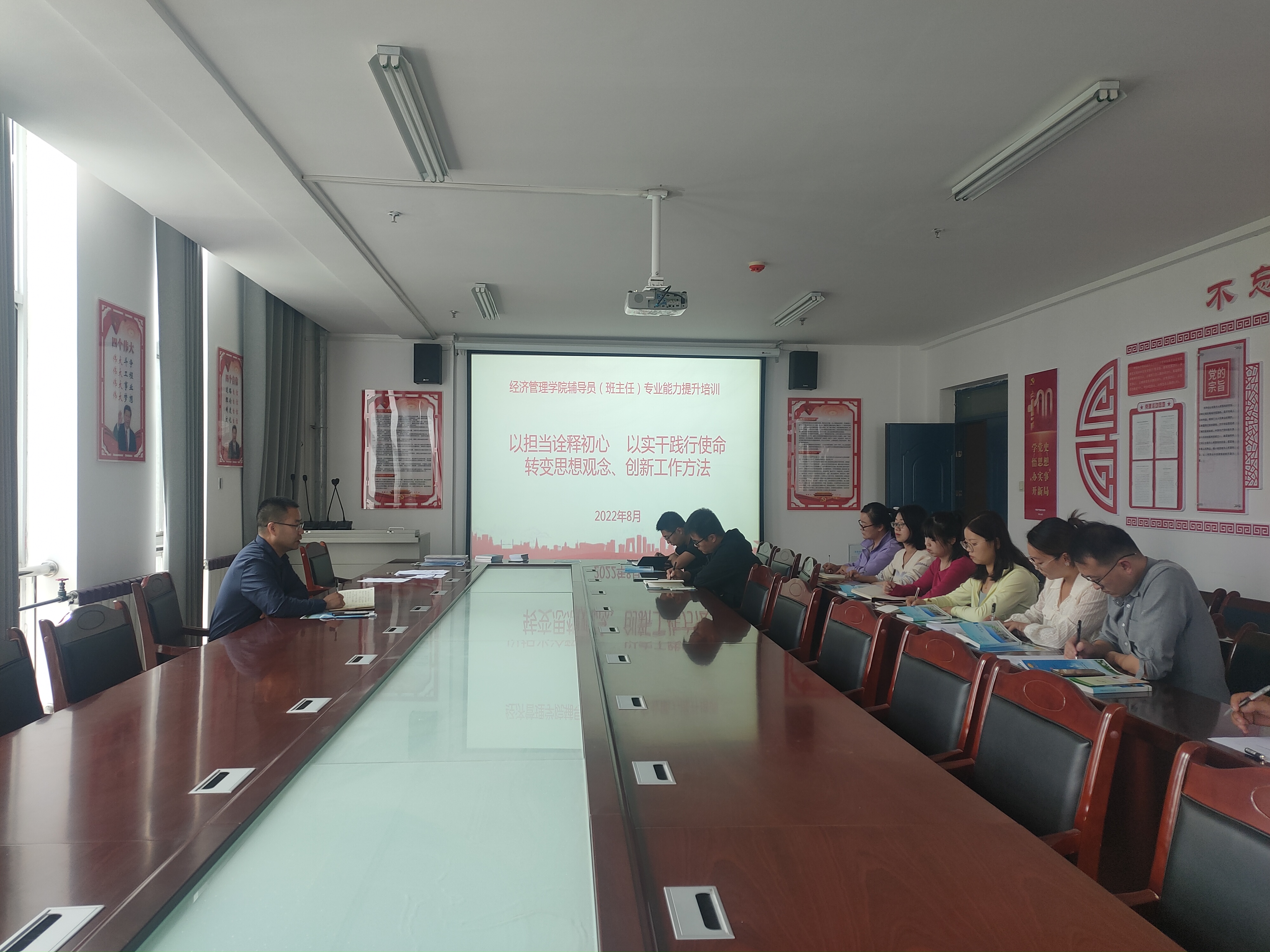 為提高學(xué)生管理水平,提升班主任隊伍整體素質(zhì),經(jīng)濟管理學(xué)院于8月30日在經(jīng)緯樓306會議室召開了“以擔(dān)當(dāng)詮釋初心 以實干踐行使命---——轉(zhuǎn)變思想觀念、創(chuàng)新工作方法”為主題的班主任專業(yè)能力提升培訓(xùn)會。會議由經(jīng)濟管理學(xué)院黨總支書記張伯成主持,全體班主任、輔導(dǎo)員參加了本次會議。