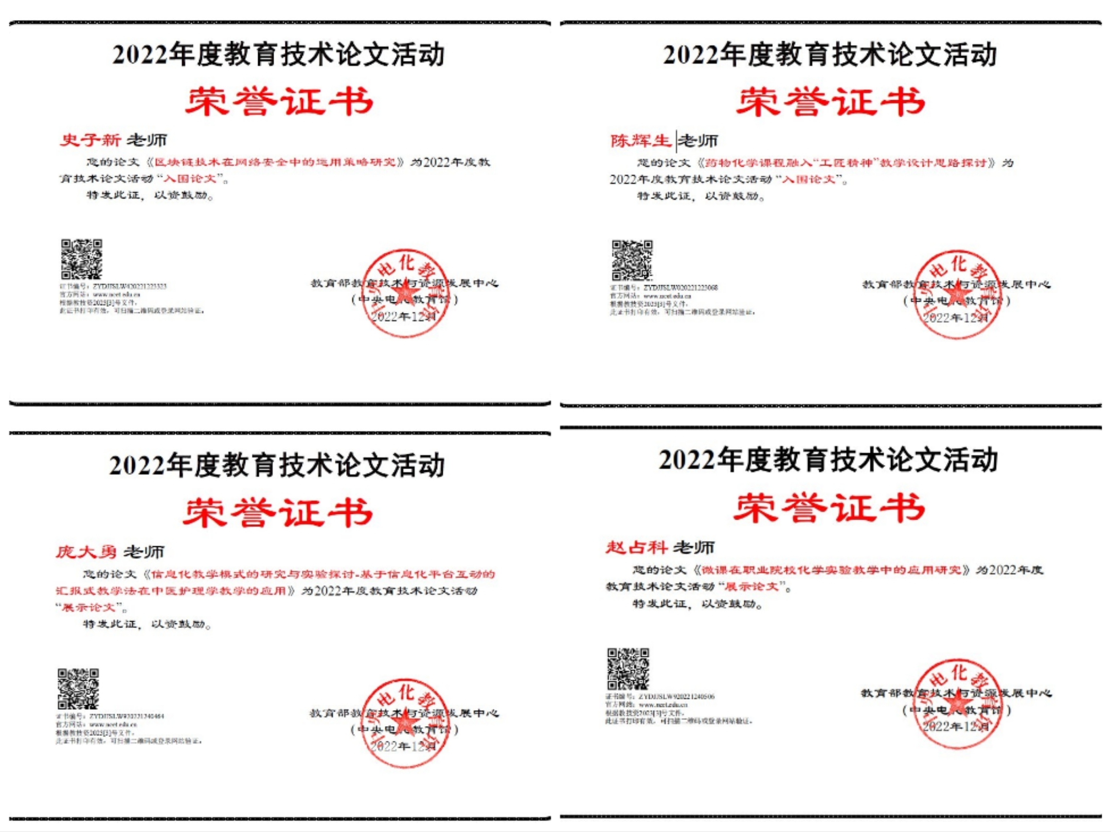 近日,教育部教育技術(shù)與資源發(fā)展中心(中央電化教育館)2022年全國師生信息素養(yǎng)提升實(shí)踐活動(第二十六屆教師活動)評審結(jié)果出爐。學(xué)校趙占科、龐大勇、史子新、陳輝生四名教師的教育技術(shù)論文被分別評為展示論文和入圍論文,學(xué)校在2022年度教育技術(shù)論文活動組織工作中被評為突出貢獻(xiàn)學(xué)校。