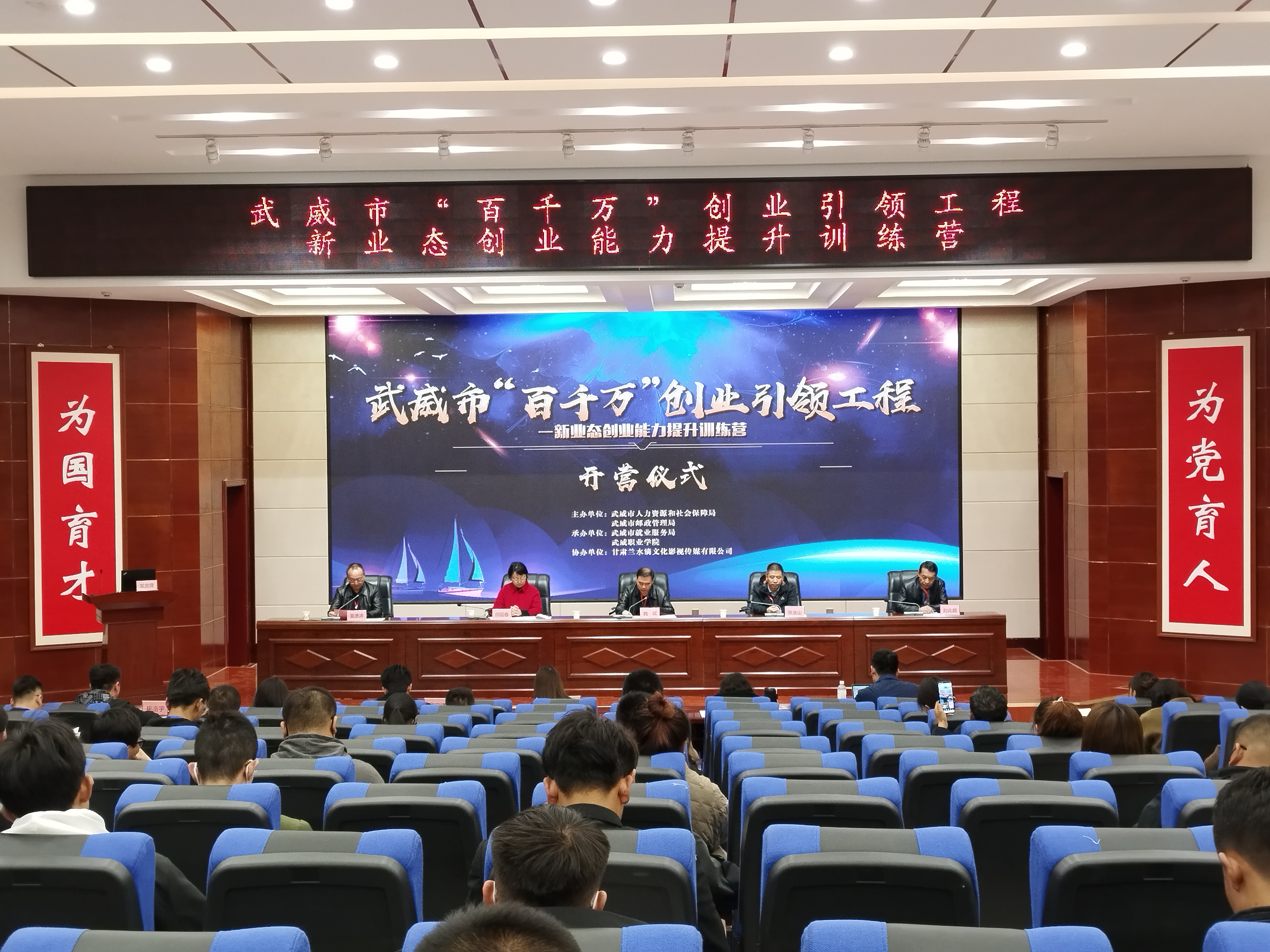 4月6日上午,由我校協(xié)辦的武威市“百千萬(wàn)”創(chuàng)業(yè)引領(lǐng)工程新業(yè)態(tài)創(chuàng)業(yè)能力提升訓(xùn)練營(yíng)在菁英廳舉辦開(kāi)營(yíng)儀式,武威市人社局黨組成員、就業(yè)局局長(zhǎng)魏斌,武威市郵政管理局黨組成員、副局長(zhǎng)張金山,武威市就業(yè)局副局長(zhǎng)劉兆順及副校長(zhǎng)田迎春出席開(kāi)營(yíng)儀式,儀式由市就業(yè)局副局長(zhǎng)夏湧濤主持。