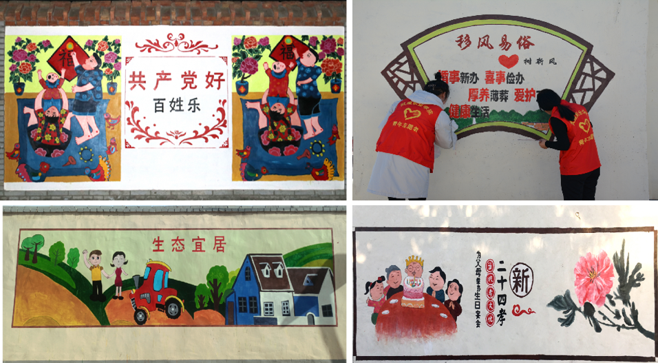 自2019 年以來,武威職業(yè)學院堅持“立足地方、融入地方、服務地方”的發(fā)展理念,將優(yōu)勢學科專業(yè)與武威市經(jīng)濟社會發(fā)展緊密結合,組織師生開展“打造人文美居助力鄉(xiāng)村振興”墻體彩繪志愿服務項目,通過墻體彩繪反映黨的領導下農(nóng)村精神風貌的變化和取得的成就,將村莊重點街巷屋面墻體繪制出一幅幅反映美麗鄉(xiāng)村建設、社會主義核心價值觀、移風易俗、鄉(xiāng)風文明等為主題的墻體畫,形象生動、 通俗易懂的內容讓村民變“被動學”為“主動看”,不僅展現(xiàn)了農(nóng)村新生活、農(nóng)業(yè)新氣象、農(nóng)民新面貌,美化了村容村貌,為美麗鄉(xiāng)村建設、人居環(huán)境美化添磚加瓦。
