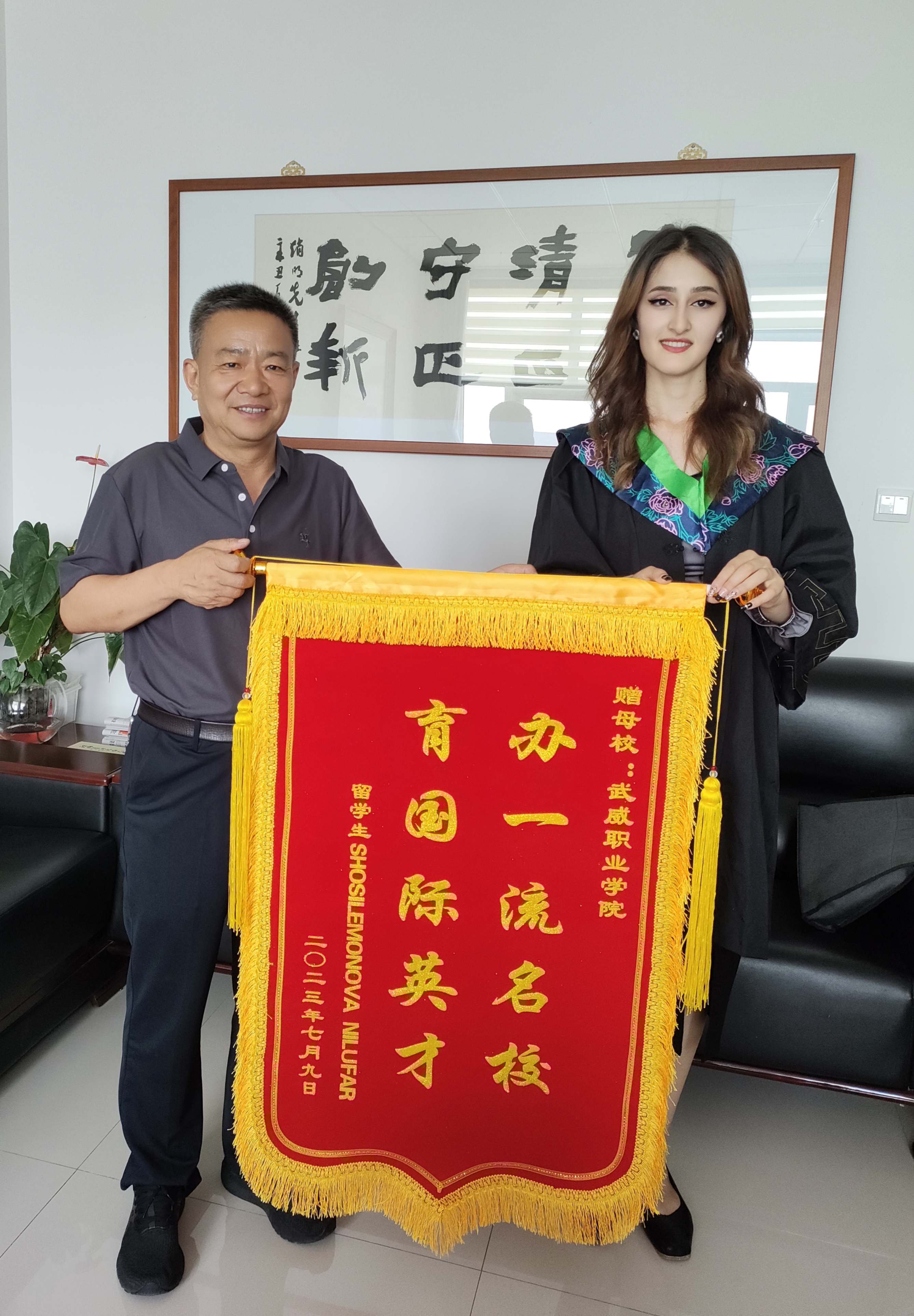 國際學(xué)生HOSILEMONOVA NILUFAR(妮娜)向?qū)W校贈(zèng)送“辦一流名校 育國際英才”的感謝旌旗,對(duì)學(xué)校精心、悉心培養(yǎng)自己表達(dá)了由衷的感謝,表示在武威職業(yè)學(xué)院收獲了專業(yè)技能和人生閱歷,接觸到了先進(jìn)技術(shù)技能和前沿思想,特別是通過學(xué)習(xí)中國文化,深刻認(rèn)識(shí)到文化交流的重要性,也更加堅(jiān)定了自己繼續(xù)學(xué)習(xí)中文和中國文化的決心。