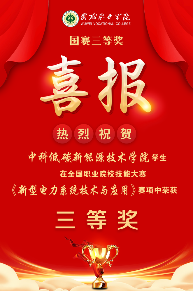 在2023年全國職業(yè)院校技能大賽中中科低碳新能源技術(shù)學(xué)院學(xué)生陳德平、徐浩芝、蘆紀(jì)維獲得高職組新型電力系統(tǒng)技術(shù)與應(yīng)用賽項(xiàng)團(tuán)體三等獎。