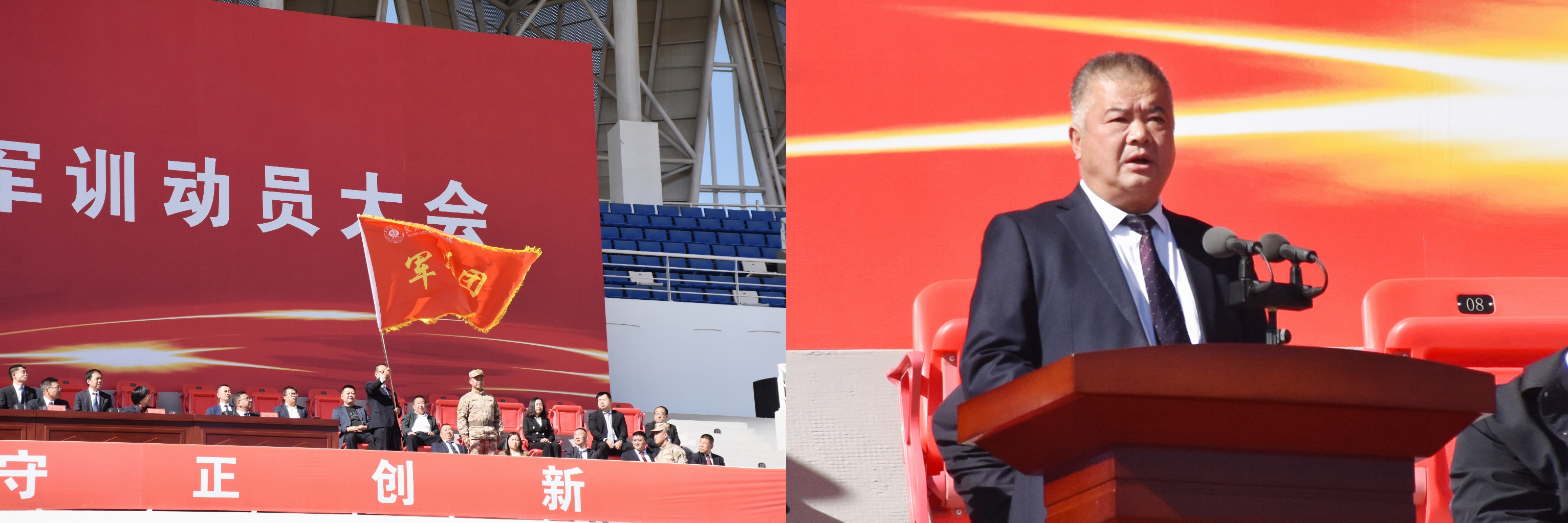 軍訓(xùn)動(dòng)員階段,黨委委員,副校長王守云安排了2023級(jí)新生軍訓(xùn)工作,軍訓(xùn)教官李昌泰作發(fā)言,黨委副書記翟存祥向軍訓(xùn)團(tuán)授旗。