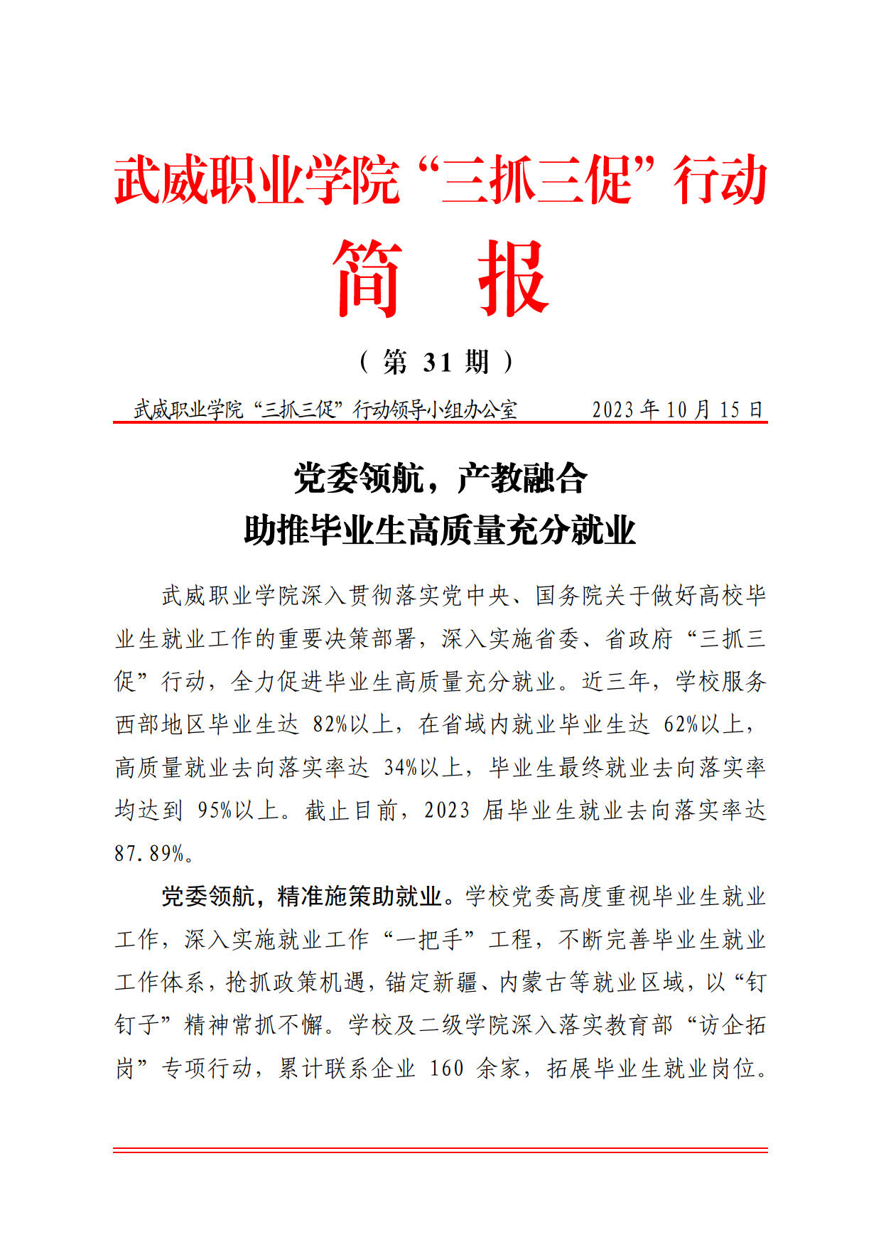 簡(jiǎn)報(bào)第31期:黨委領(lǐng)航、產(chǎn)教融合,助推畢業(yè)生高質(zhì)量充分就業(yè)