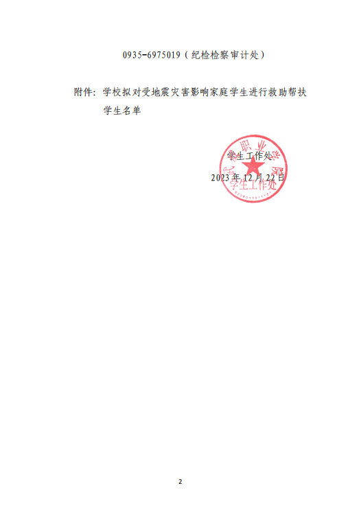 武威職業(yè)學(xué)院關(guān)于對(duì)受地震災(zāi)害影響家庭學(xué)生進(jìn)行救助幫扶學(xué)生名單的公示