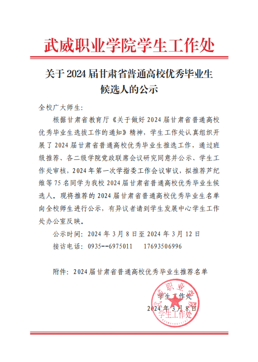 關(guān)于2024屆武威職業(yè)學(xué)院優(yōu)秀畢業(yè)生候選人的公示