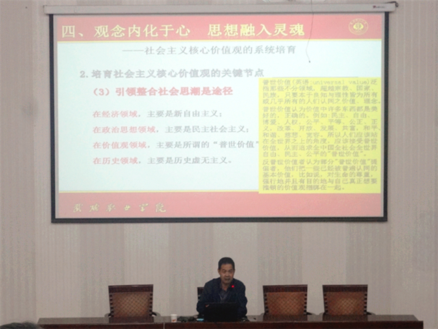 翟存祥從人民要有信仰國家才有力量、凝聚中國精神傳遞中國聲音、時代召喚理論理論助推時間、觀念內(nèi)化于心思想融入靈魂、精神外化于行夢想落地生根等五個方面入手,運用哲學(xué)社會學(xué)、文化心理學(xué)、國學(xué)文化等學(xué)科領(lǐng)域上的獨特見解,將傳統(tǒng)文化和社會科學(xué)深度融合,對社會主義核心價值觀產(chǎn)生的時代背景、頂層設(shè)計、與核心價值體系的關(guān)系、系統(tǒng)培育、全面踐行等問題進行了深入剖析,為全系師生擺脫生活困擾、消除不健康思維傾向、打造正確人生夢想、積極學(xué)習(xí)、努力工作、快樂生活鎖定了正確的思維方向,其生動的語言、精彩的論證、獨具特色的講座風(fēng)格,獲得了在場師生的熱烈歡迎和陣陣掌聲。