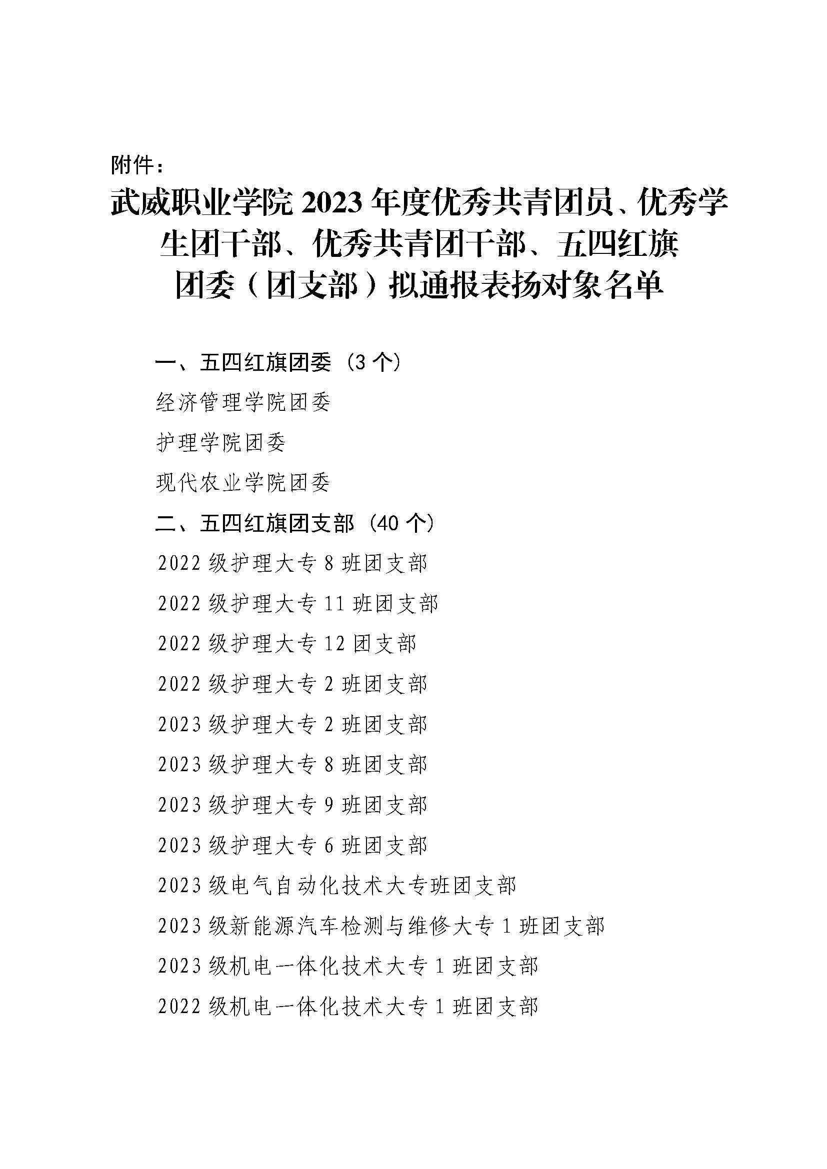 關(guān)于武威職業(yè)學院2023年度優(yōu)秀共青團員、優(yōu)秀學生團干部、優(yōu)秀共青團干部、五四紅旗團委(團支部)擬通報表揚對象的公示