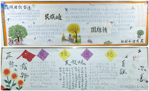 各班圍繞“謳歌民族團(tuán)結(jié)、共建和諧校園”主題進(jìn)行了精心的設(shè)計,圖文并茂,內(nèi)容豐富,形式多樣。大力宣傳了黨的民族理論和民族政策以及各民族共同團(tuán)結(jié)奮斗、共同繁榮發(fā)展的民族關(guān)系。