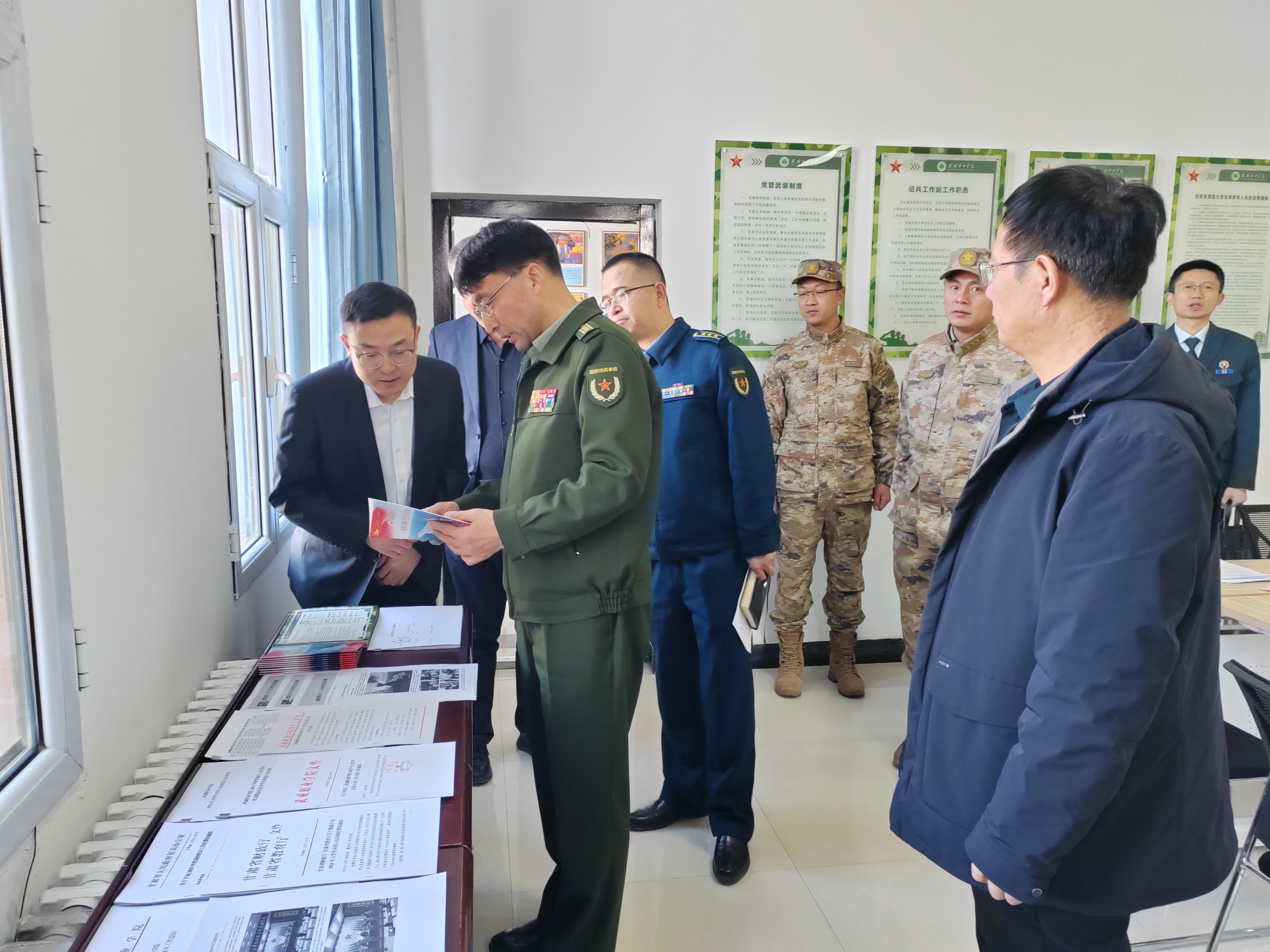 1月9日下午,武威市征兵領(lǐng)導(dǎo)小組副組長(zhǎng)、軍分區(qū)大校司令員陳習(xí)友帶工作組一行5人,來(lái)我校調(diào)研征兵工作開(kāi)展情況。校長(zhǎng)、黨委副書(shū)記張開(kāi)禮,黨委委員、副校長(zhǎng)王守云陪同調(diào)研。