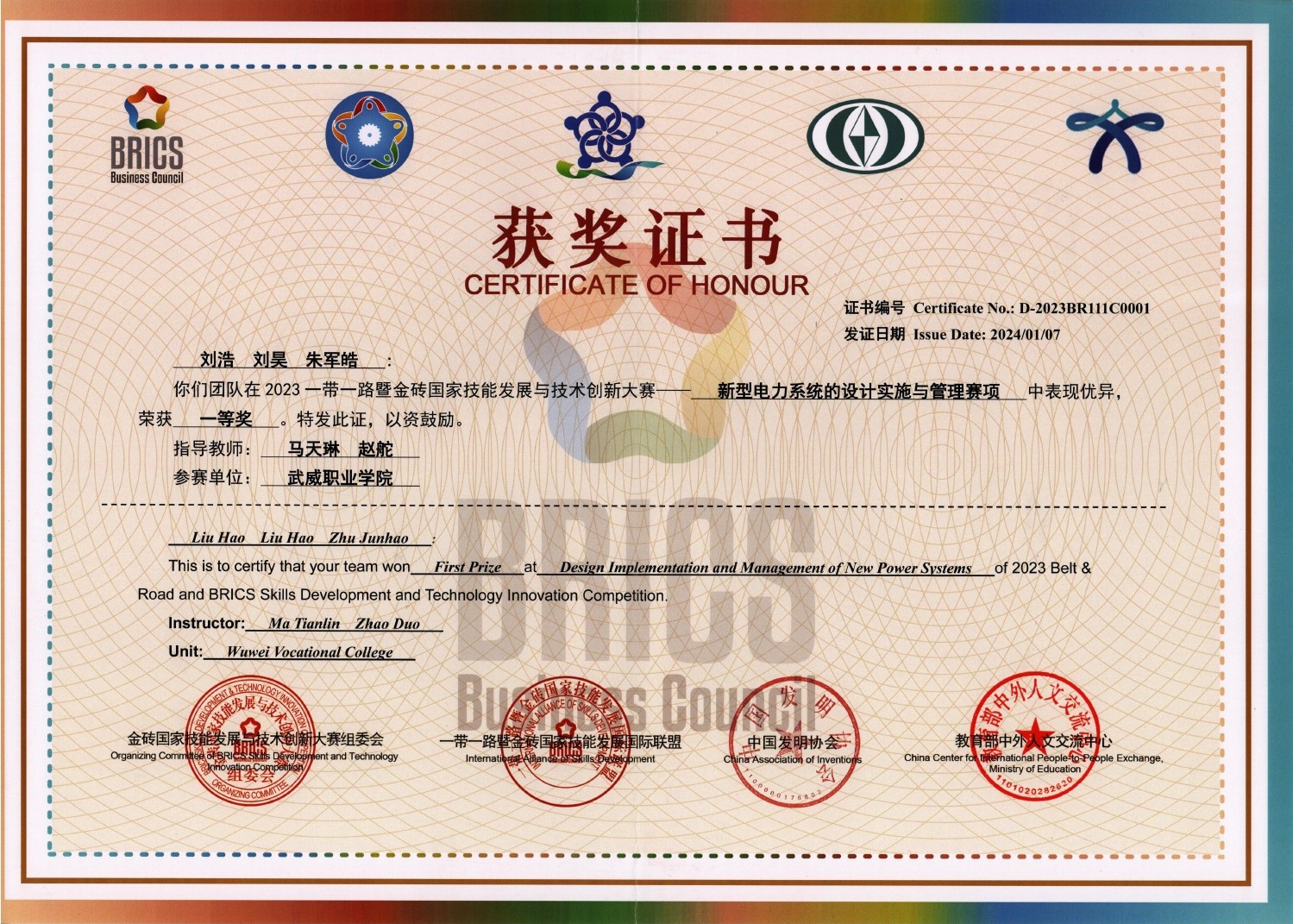 2023年一帶一路暨金磚國(guó)家技能發(fā)展與技術(shù)創(chuàng)新大賽新型電力系統(tǒng)的設(shè)計(jì)實(shí)施賽項(xiàng)一等獎(jiǎng)