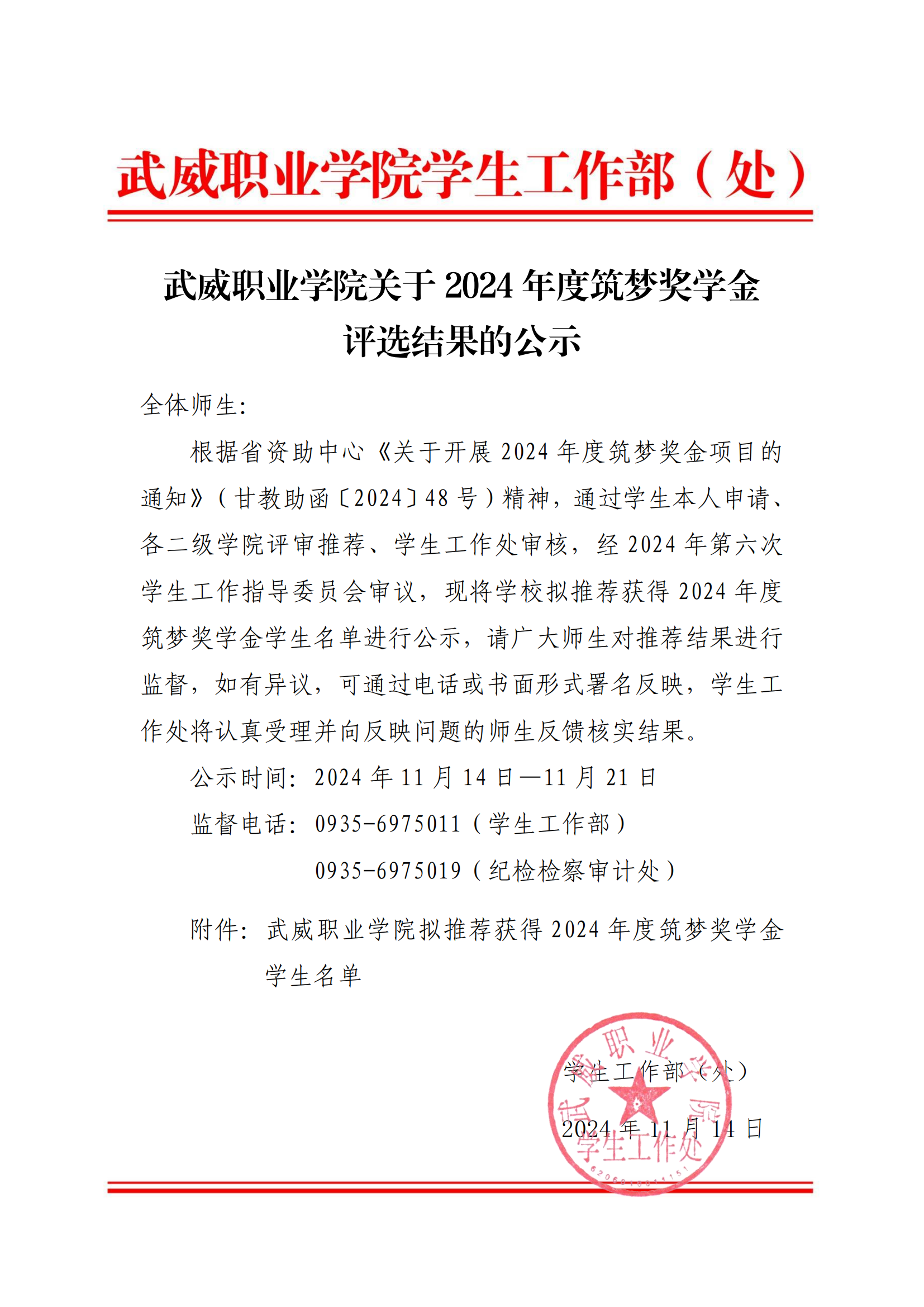 武威職業(yè)學(xué)院關(guān)于2024年度筑夢(mèng)獎(jiǎng)學(xué)金評(píng)選結(jié)果的公示