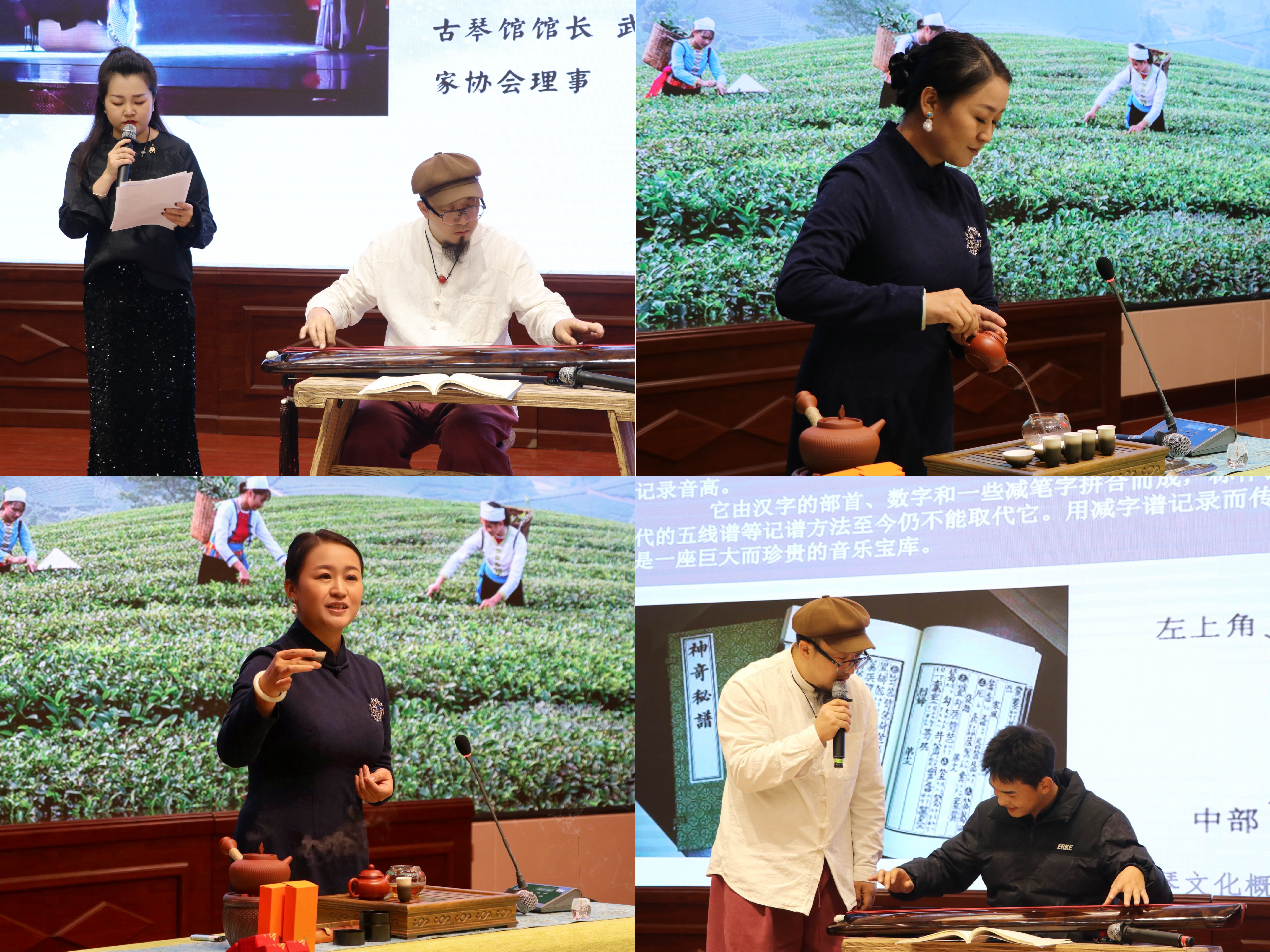活動中,武威市青年音樂家協(xié)會聲樂學(xué)會會長陳菲和古琴協(xié)會會長霍宏昌共同奏唱多首經(jīng)典作品。琴聲悠揚(yáng),旋律動人,將現(xiàn)場聽眾帶入古代文人雅士的詩意世界。武威市古琴協(xié)會茶道學(xué)會主任白煜為現(xiàn)場觀眾表演“臺灣21式功夫茶”茶藝,白老師從茶葉的種植、采摘到?jīng)_泡技巧,再到品茶的心境,展示了中國功夫茶的沖泡流程與品鑒方法,分享了中國茶文化的歷史與精髓。