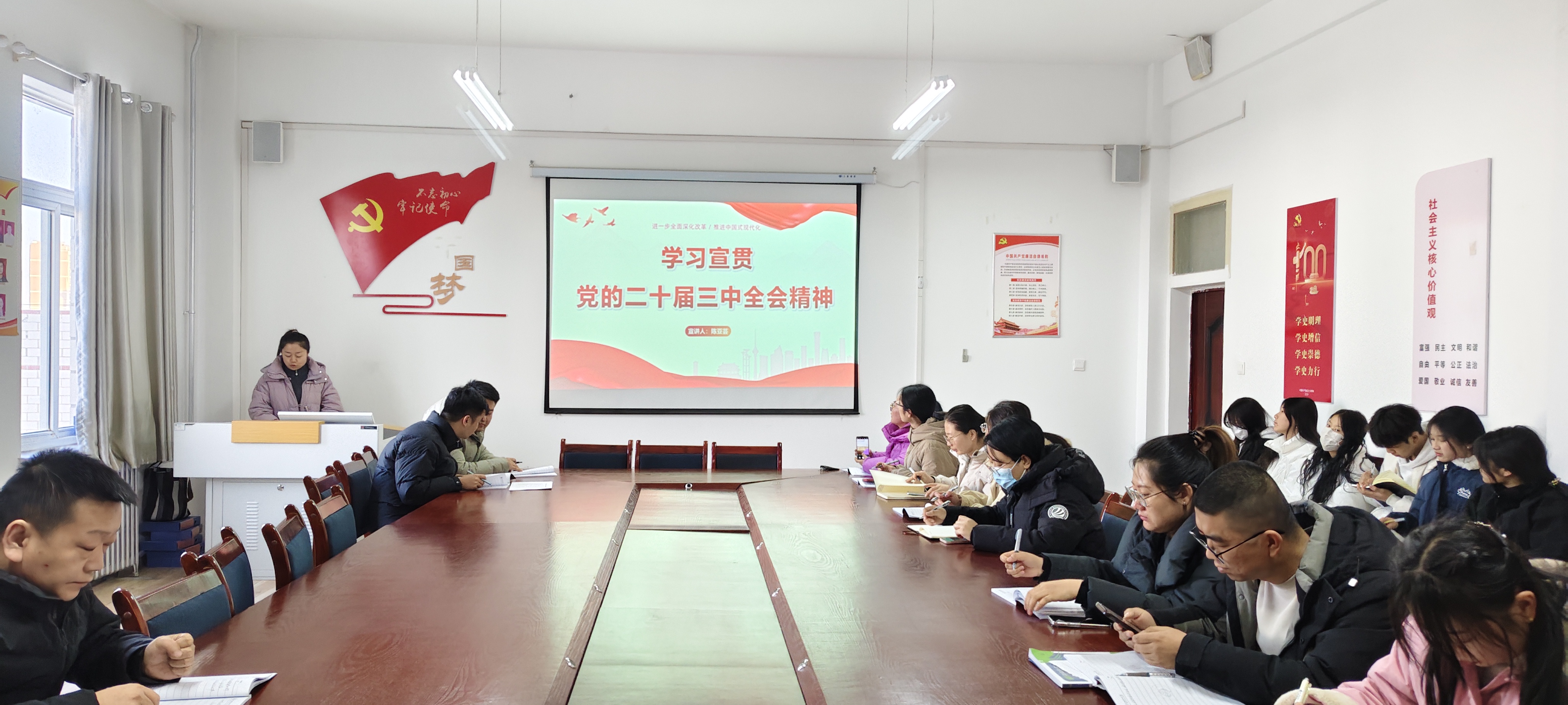 會上,陳亞蕓聚焦黨的二十屆三中全會精神,從深刻認(rèn)識黨的二十屆三中全會的主題和意義,深入學(xué)習(xí)領(lǐng)會習(xí)近平總書記在全會上的重要講話精神,全面準(zhǔn)確理解《中共中央關(guān)于進(jìn)一步全面深化改革、推進(jìn)中國式現(xiàn)代化的決定》提出的進(jìn)一步全面深化改革重大舉措,全力以赴貫徹落實全會精神、凝心聚力推進(jìn)職業(yè)教育高質(zhì)量發(fā)展四個方面詳細(xì)闡述,通過全面、深入、系統(tǒng)的宣講,進(jìn)一步深化與會黨員對全會精神的理解,為推動藥學(xué)院高質(zhì)量發(fā)展提供實踐指導(dǎo)。