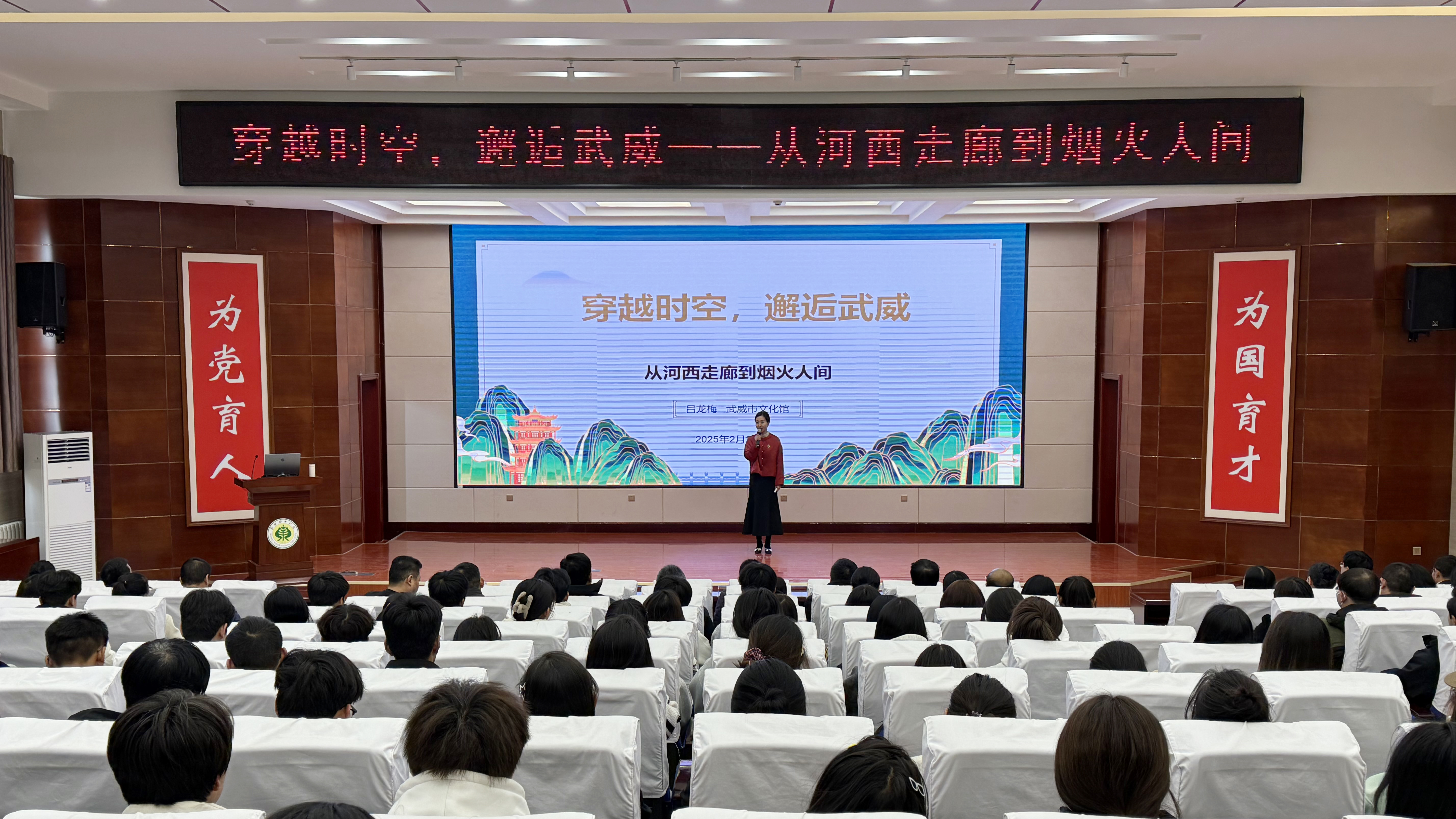 2月28日,校團(tuán)委特邀甘肅省優(yōu)秀青年文化人才、武威市文化館館長(zhǎng)呂龍梅,在學(xué)校菁英廳為師生作了題為《穿越時(shí)空,邂逅武威——從河西走廊到煙火人間》的專題講座,學(xué)校師生代表共計(jì)200余人參加了活動(dòng)。