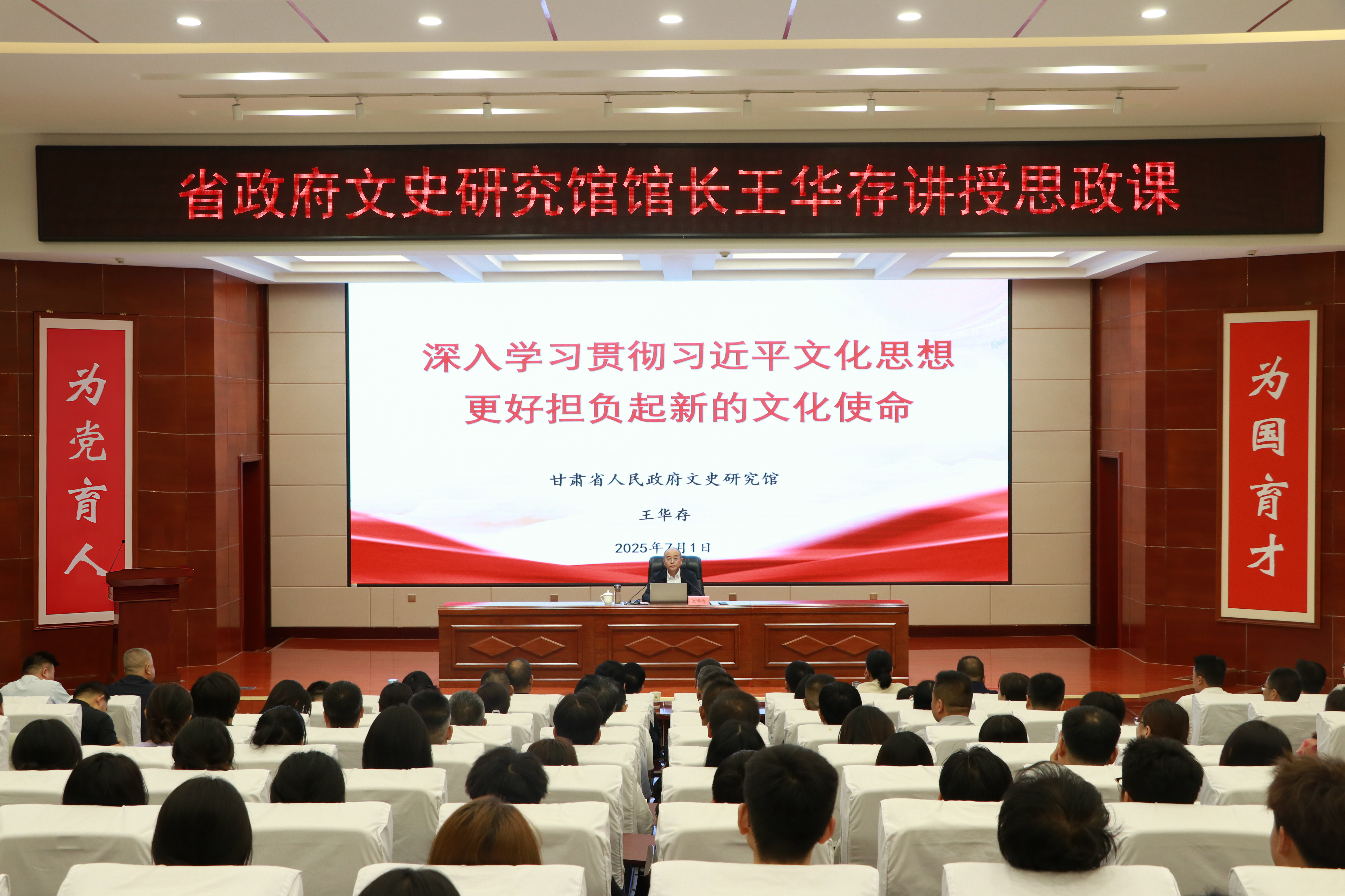7月1日,在全校上下喜迎中國共產(chǎn)黨成立104周年之際,甘肅省人民政府文史研究館黨組書記、館長王華存到學校為師生講授思想政治理論課。王華存以“深入學習貫徹習近平文化思想 更好擔負起新的文化使命”為題,從深刻認識習近平文化思想的形成過程、習近平文化思想的豐富內(nèi)涵和核心要義、甘肅文化歷史簡述、當代青年如何更好擔當起新的文化使命四個方面對習近平文化思想進行了全面解讀。黨委書記王宏主持,學校領(lǐng)導(dǎo)、中層管理干部及師生代表共200余人到場聆聽。