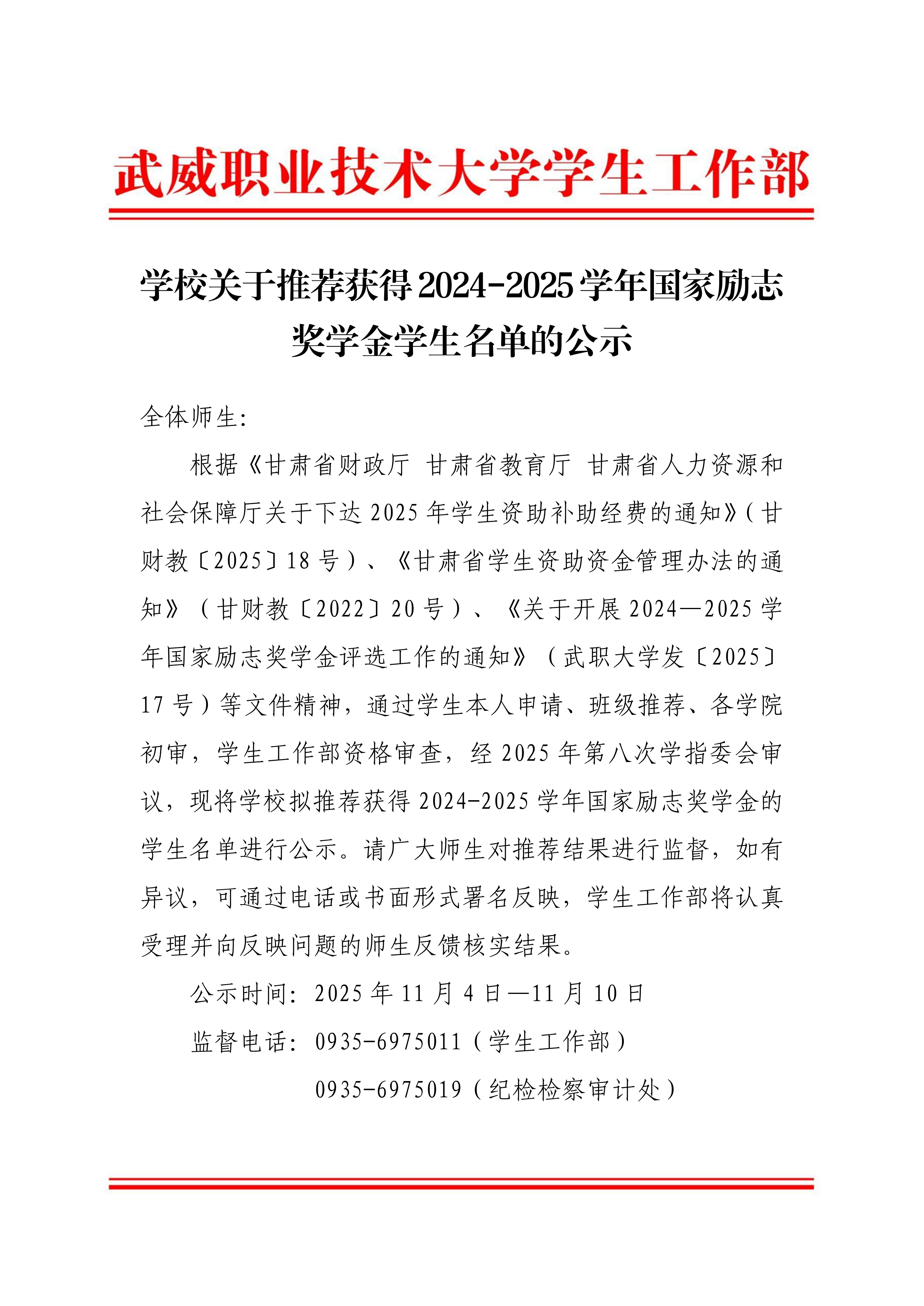 學(xué)校關(guān)于推薦獲得2024-2025學(xué)年國家勵志獎學(xué)金學(xué)生名單的公示